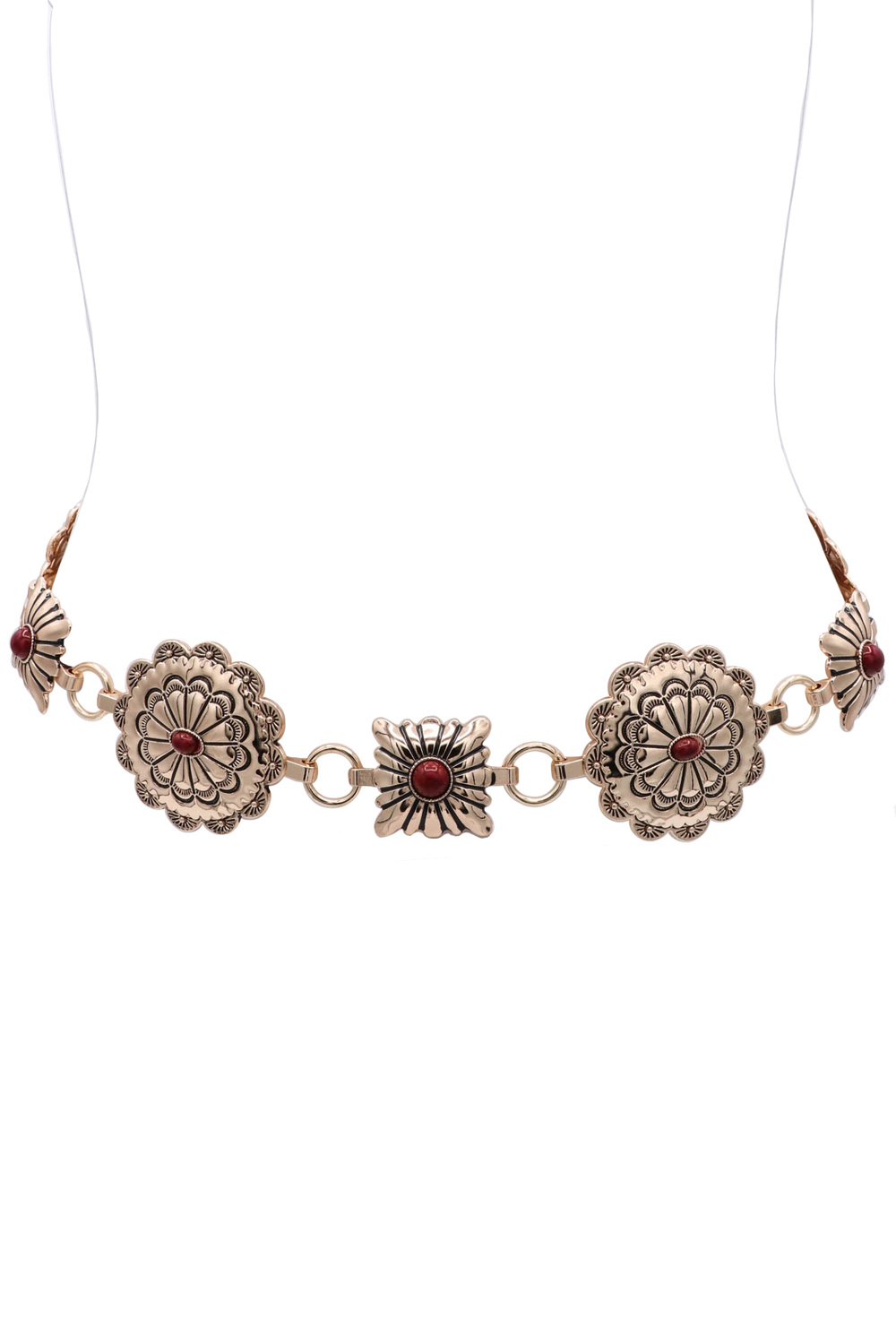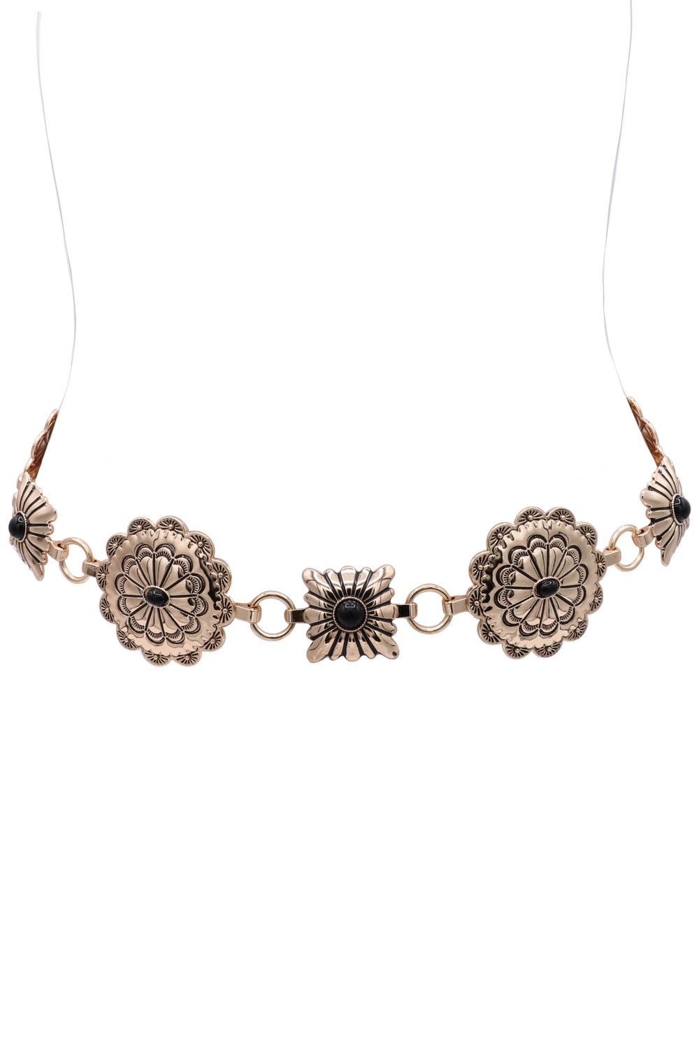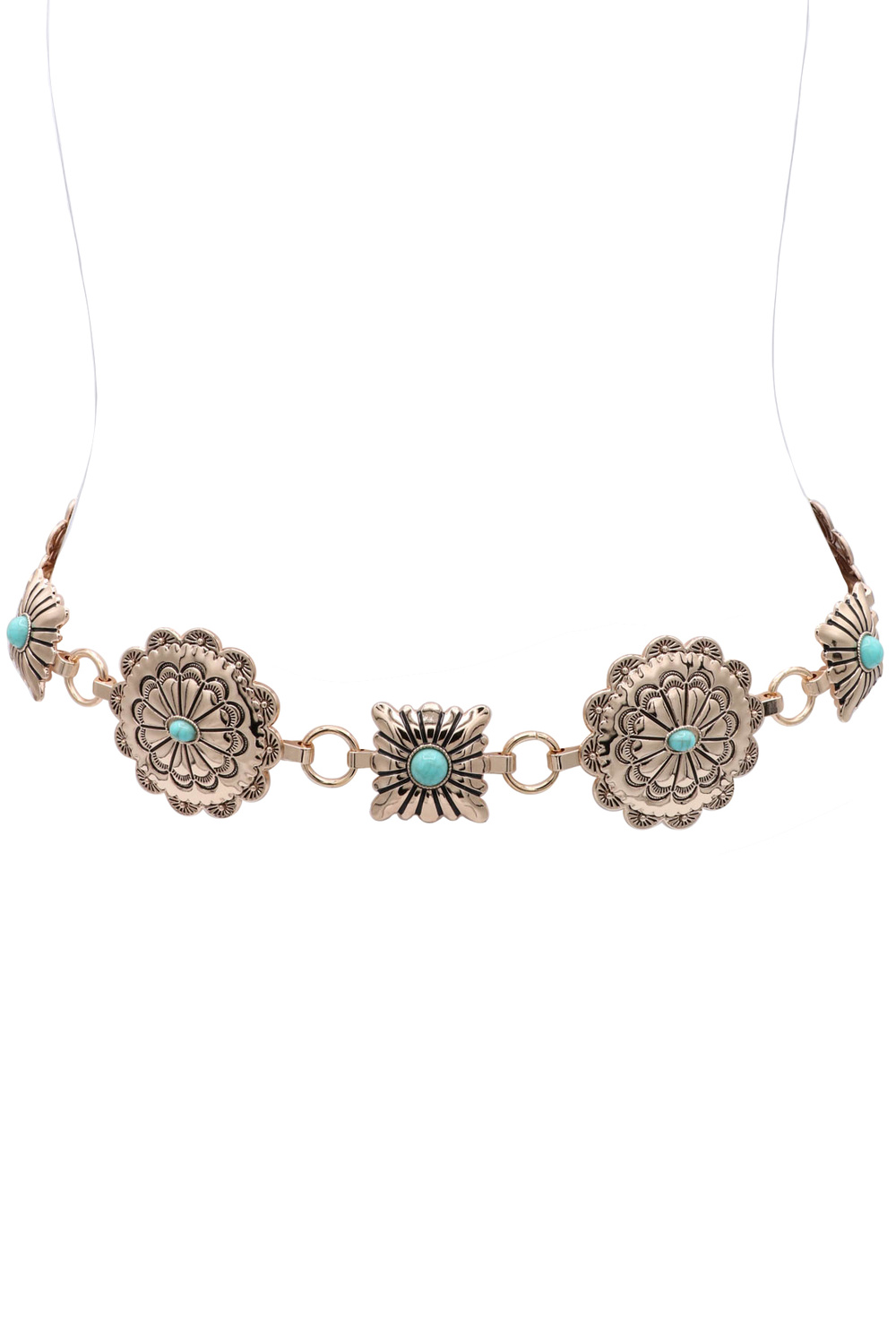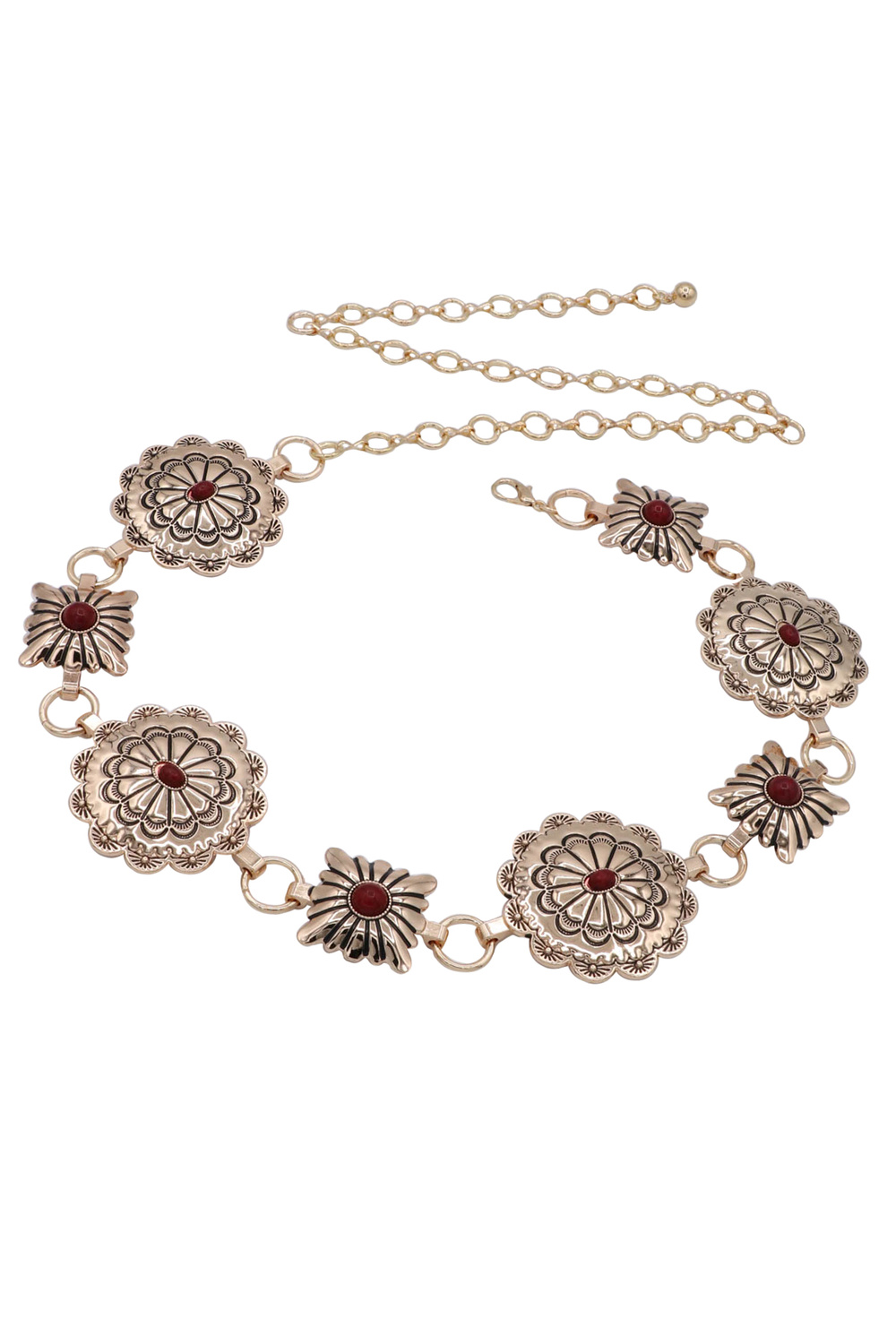 - A stylish chain belt featuring eight conchos designed with circle and square stone accents for a bold, western-inspired look. This statement accessory adds texture and charm, perfect for elevating dresses, denim, or layered outfits.