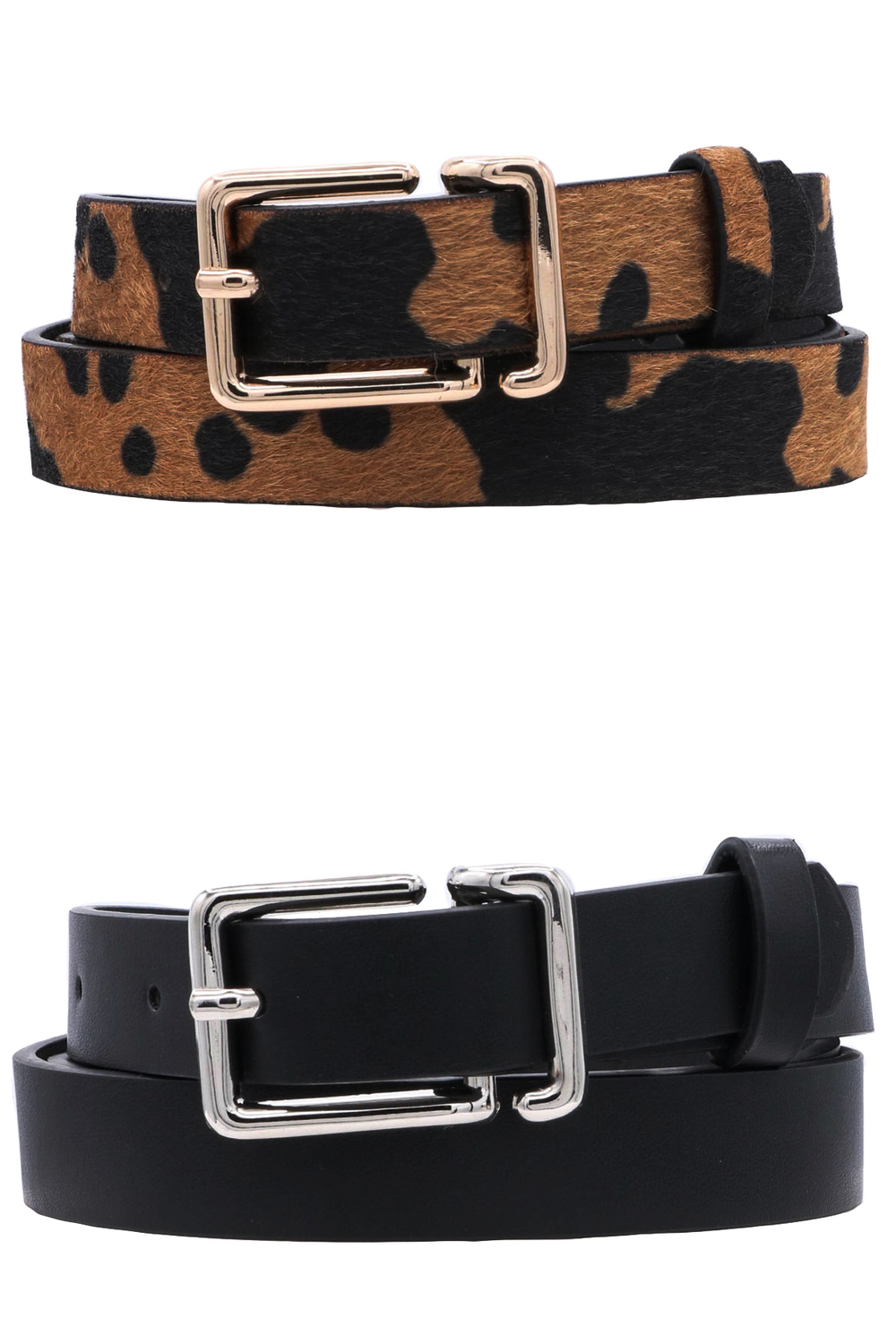 - Chic and bold, this cow print duo belt showcases a 3D D-loop rectangle buckle for a statement western-inspired look. Perfect for layering with casual or dressy outfits.