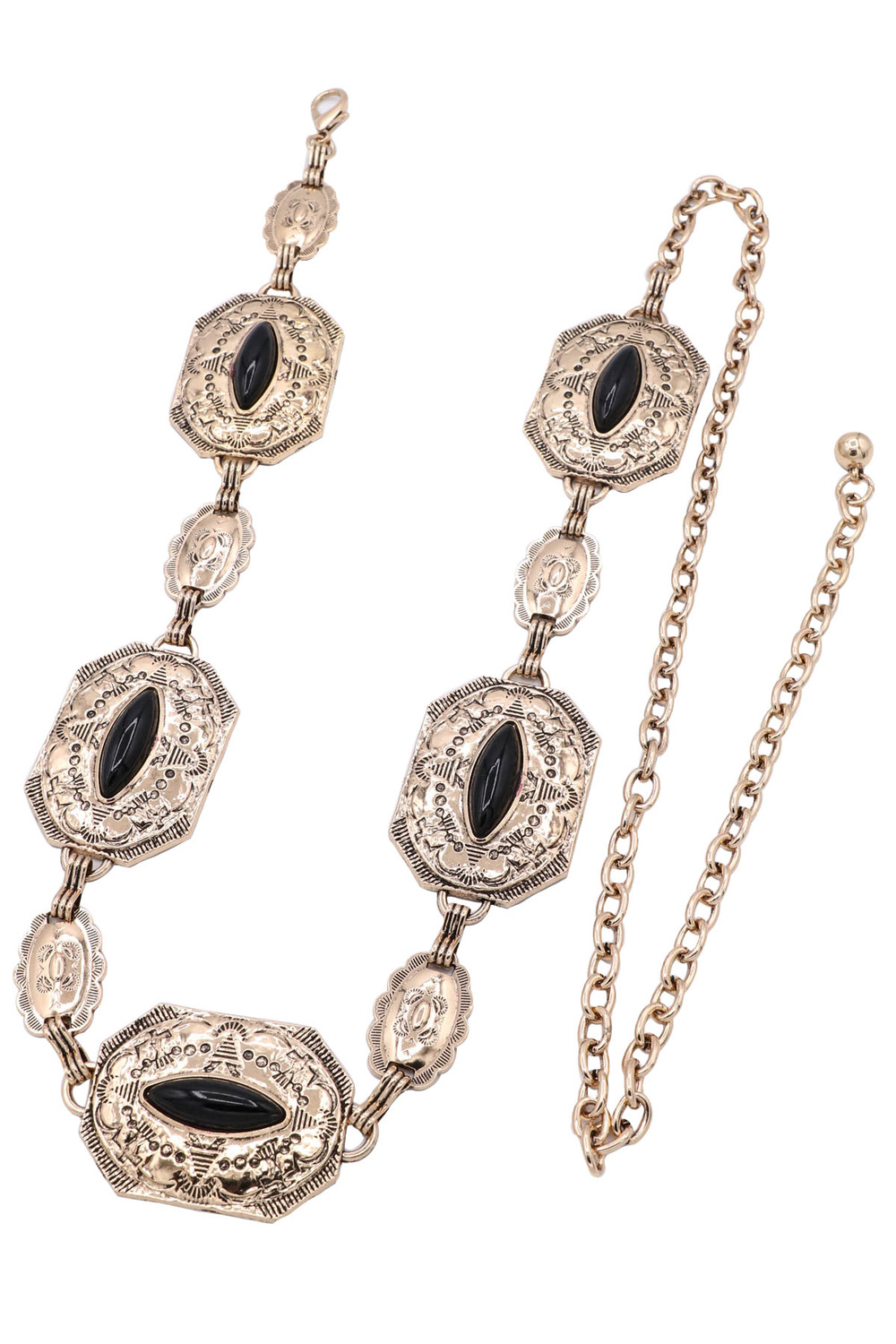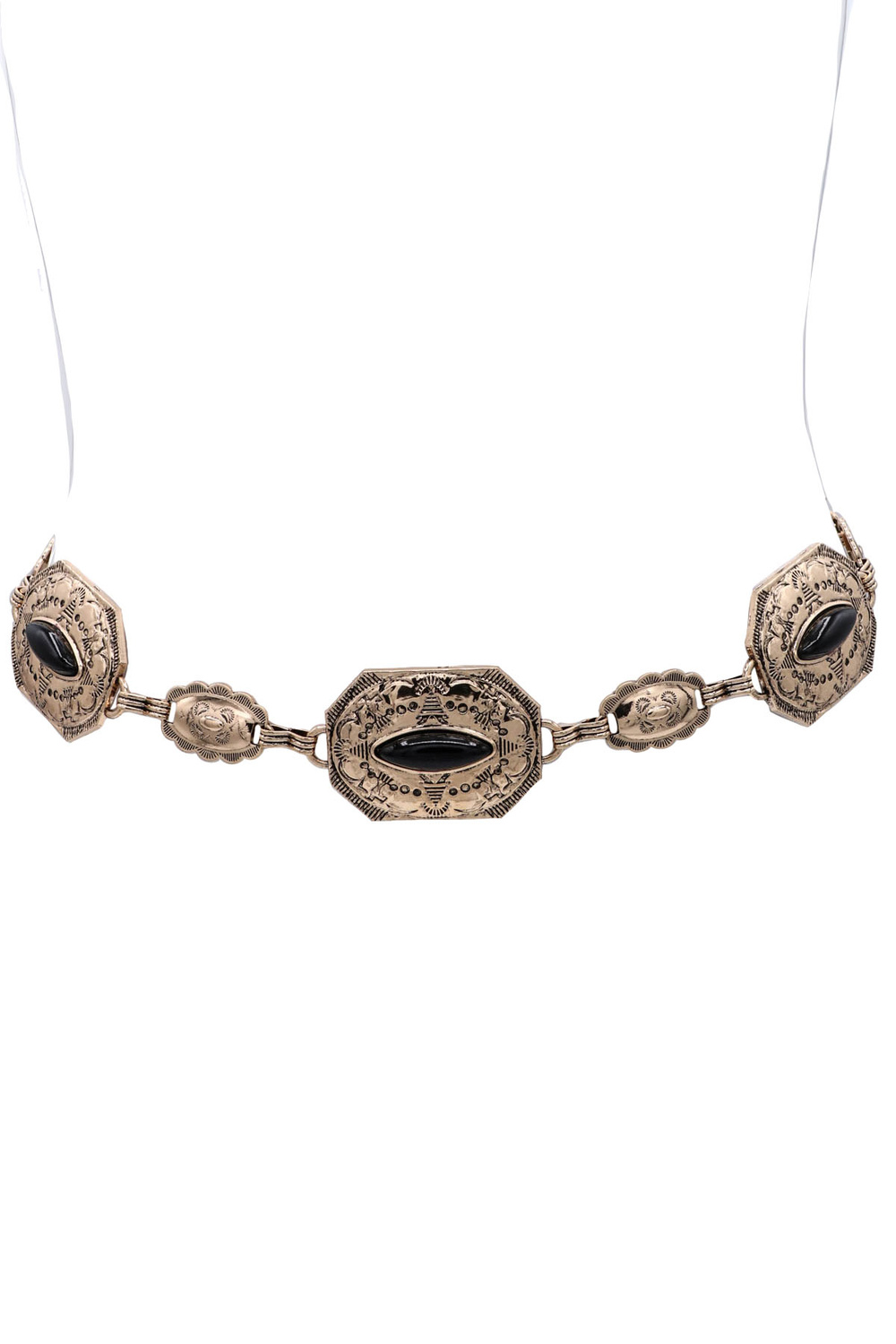 - A bold chain belt featuring mixed Southwestern conchos with CAB stone accents.