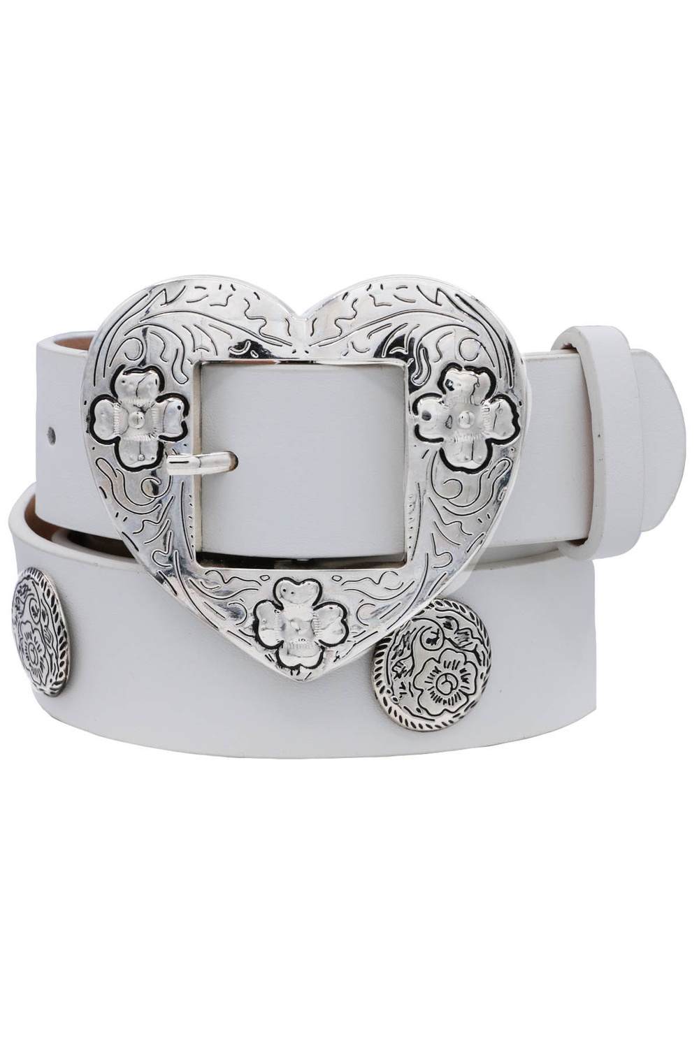 - Faux leather flora open loop through heart concho strap belt