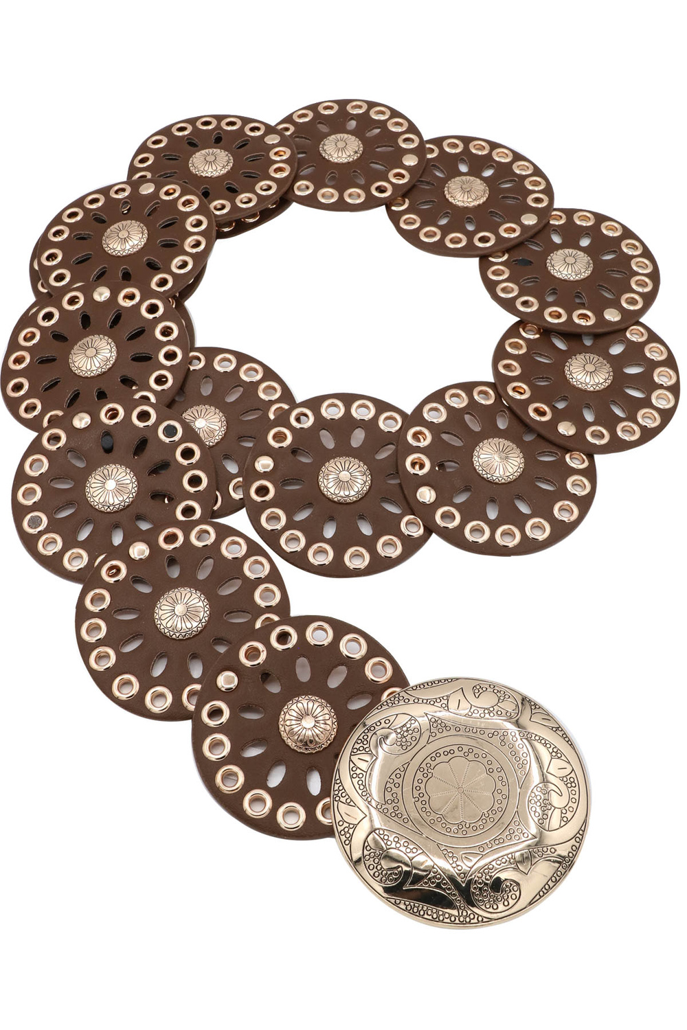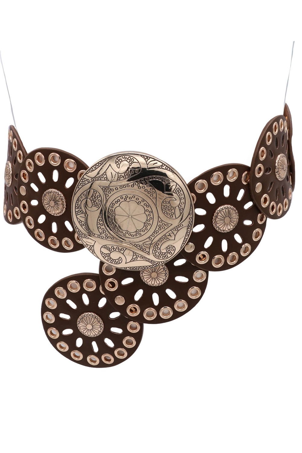 - Boho vibes, statement style. This hip belt features intricate floral mandala cut-out discs linked with metal eyelets for a bold, free-spirited look.
