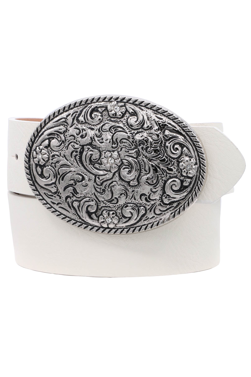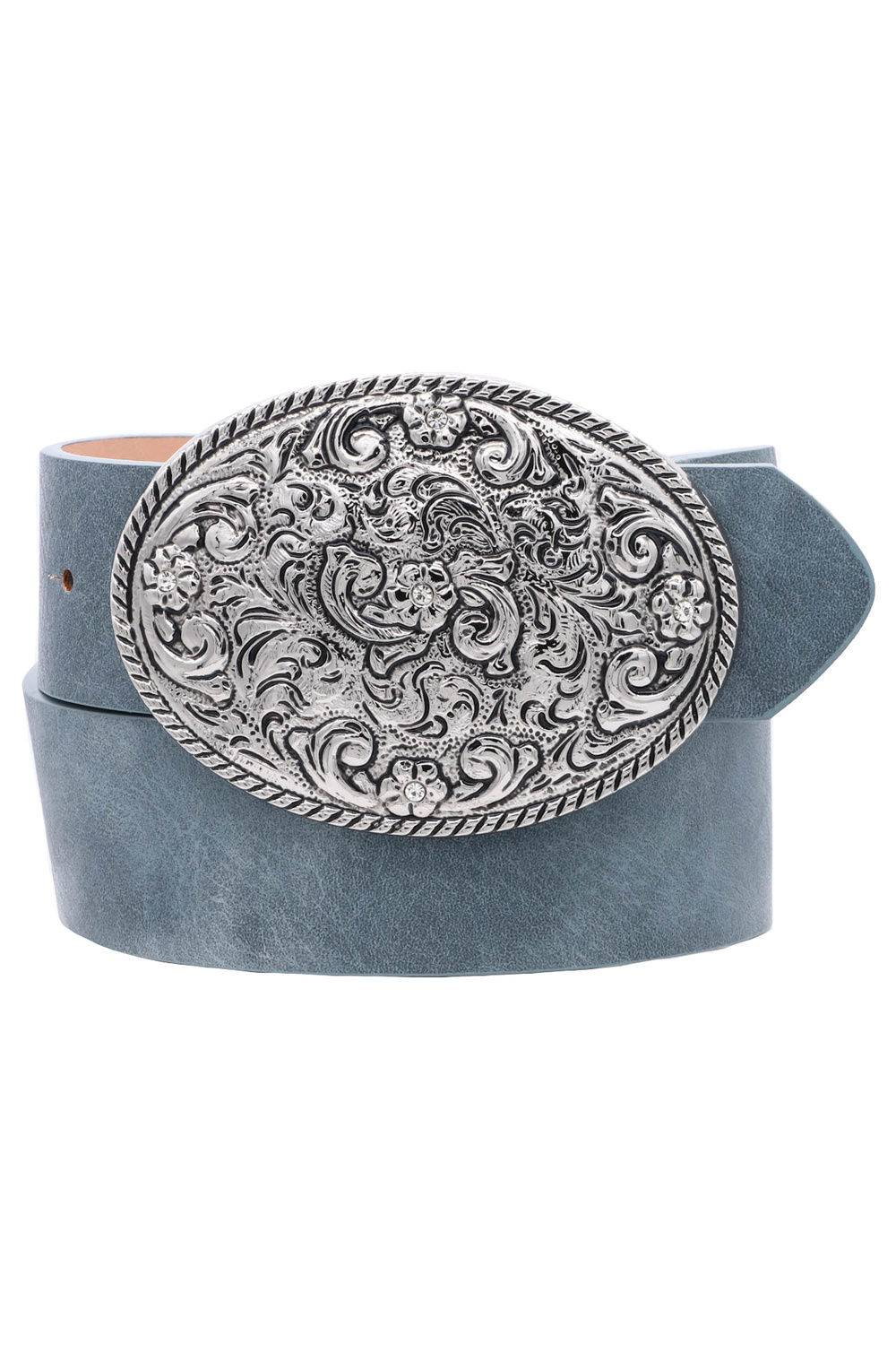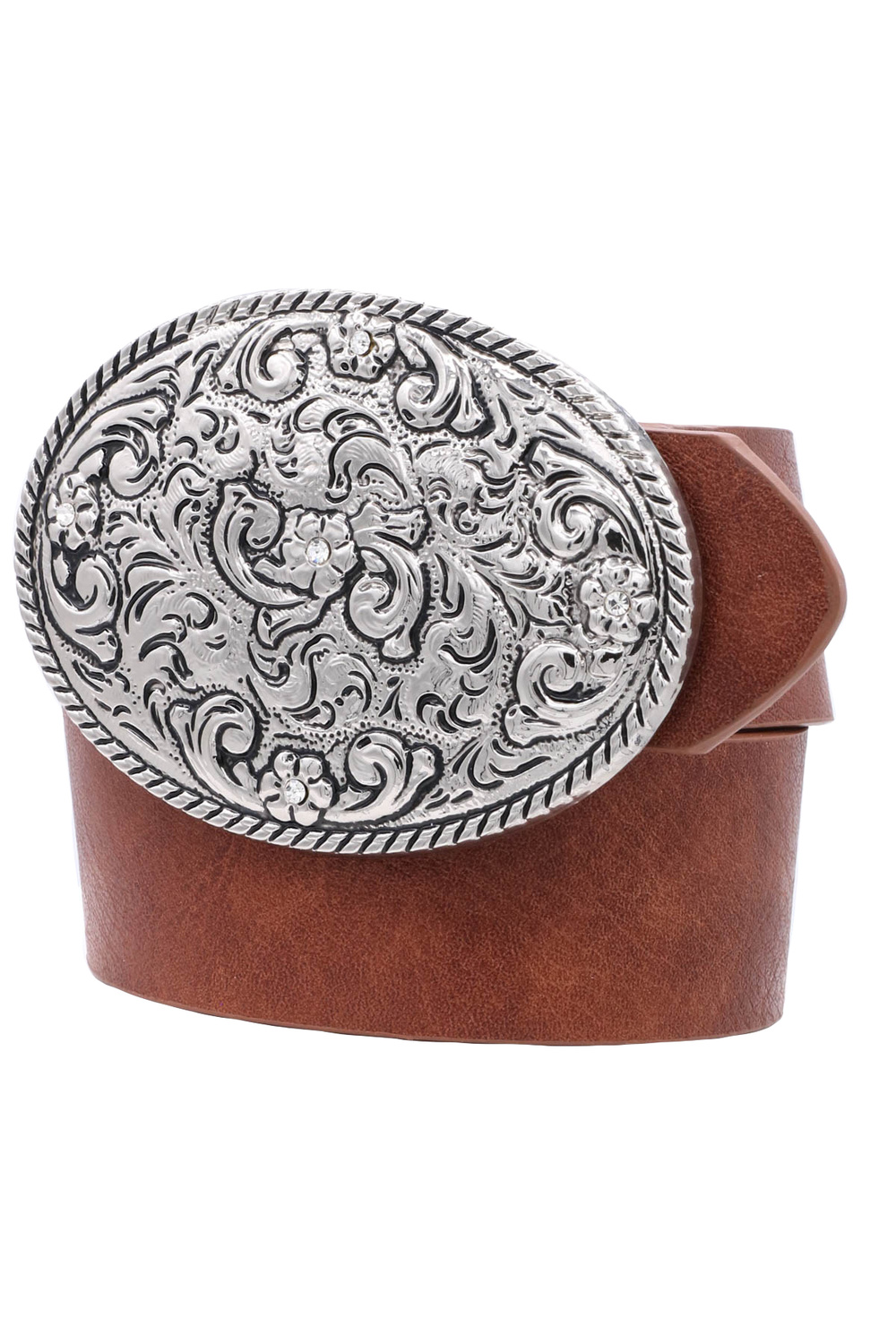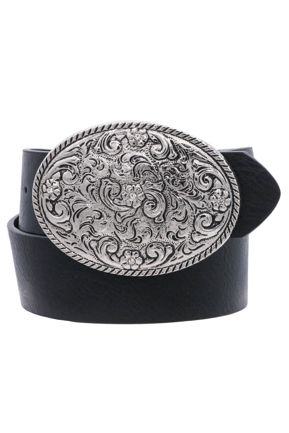 - Decorative belt featuring a swirl flower design with RS accents, rope trim detailing, and an oval buckle. A standout accessory that adds western-inspired charm to any outfit
