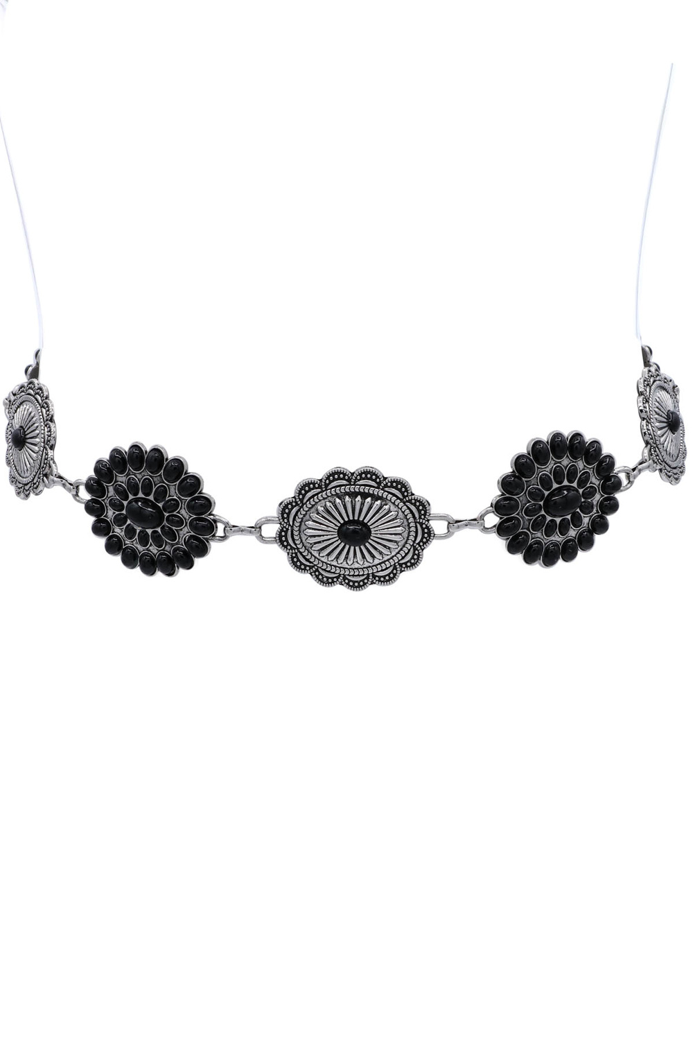 - Add a touch of Southwestern charm with this metal chain belt featuring intricate florette designs and cabochon accents