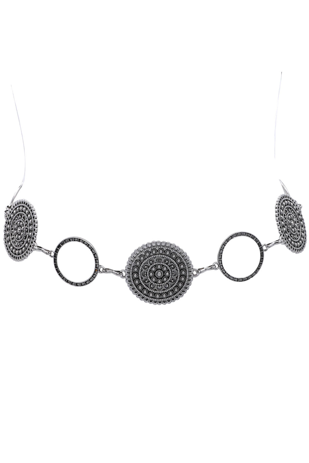 - Elevate your style with this statement chain belt featuring ribbed circle links and bold medallion accents.