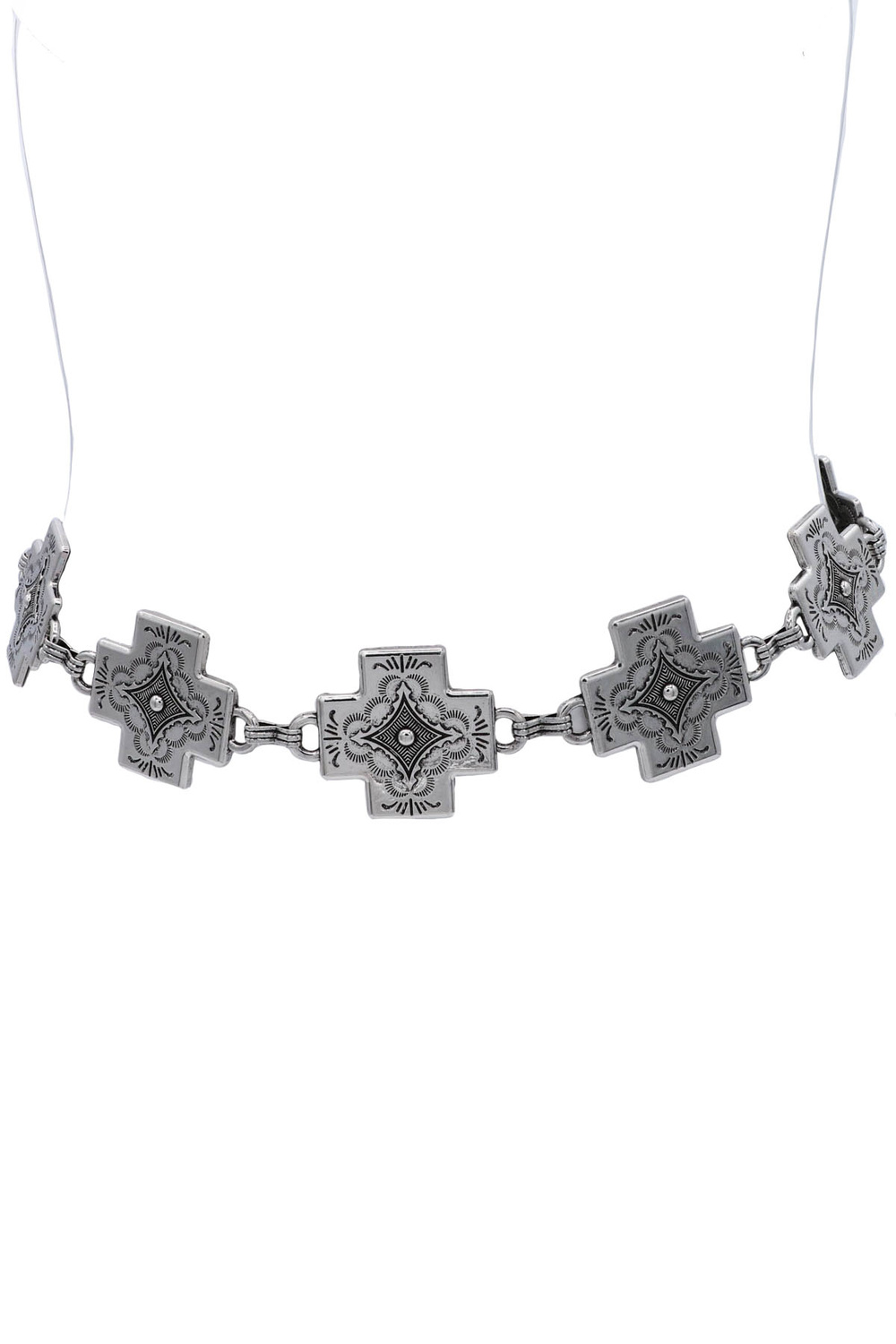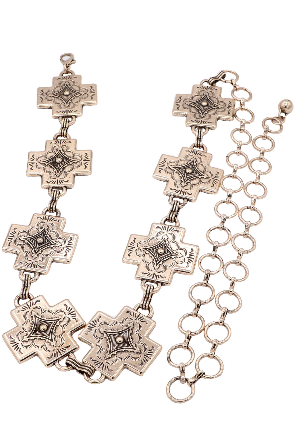- This rustic-inspired belt blends intricate cross concho detailing with a stylish chain design for a timeless yet trendy western look.