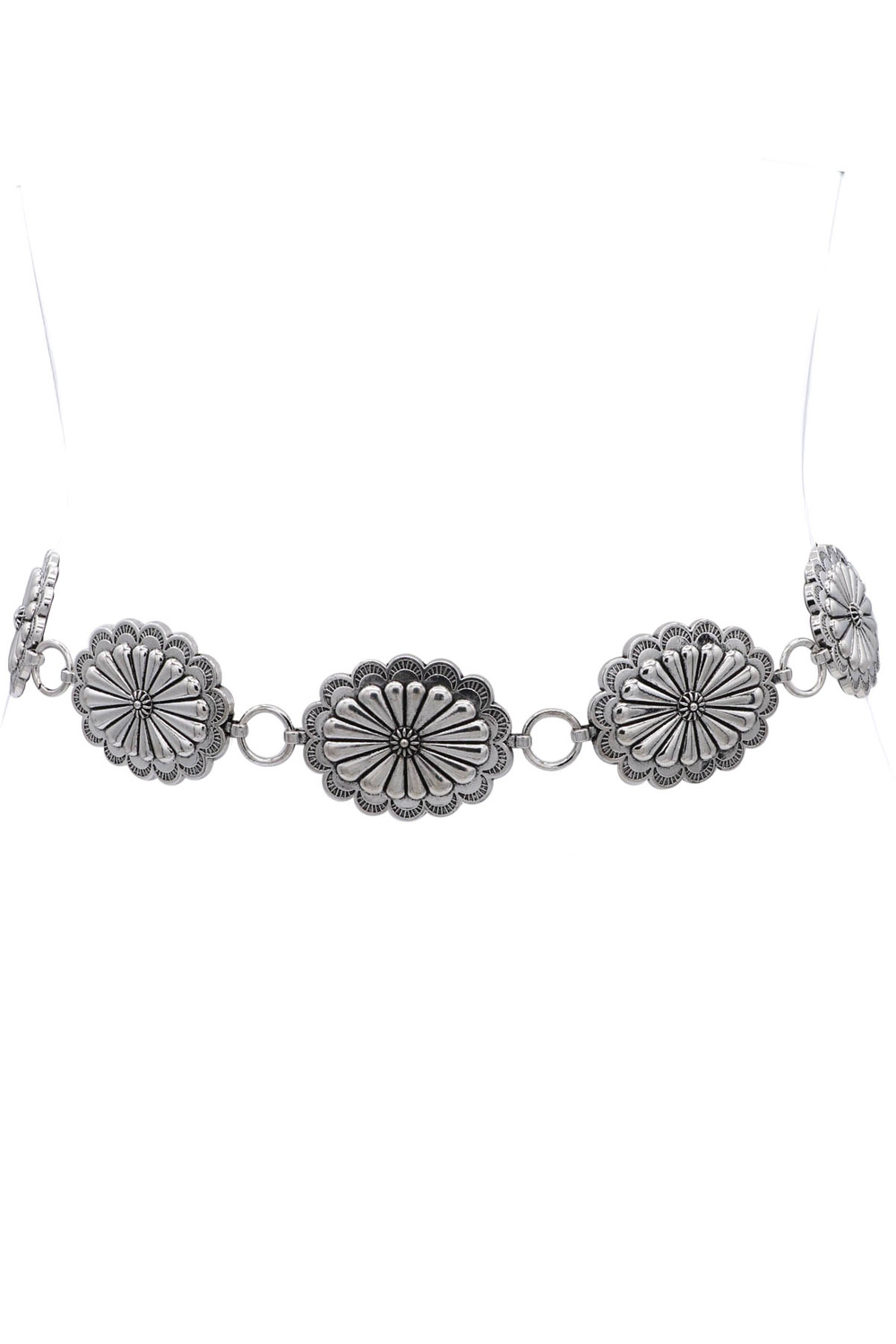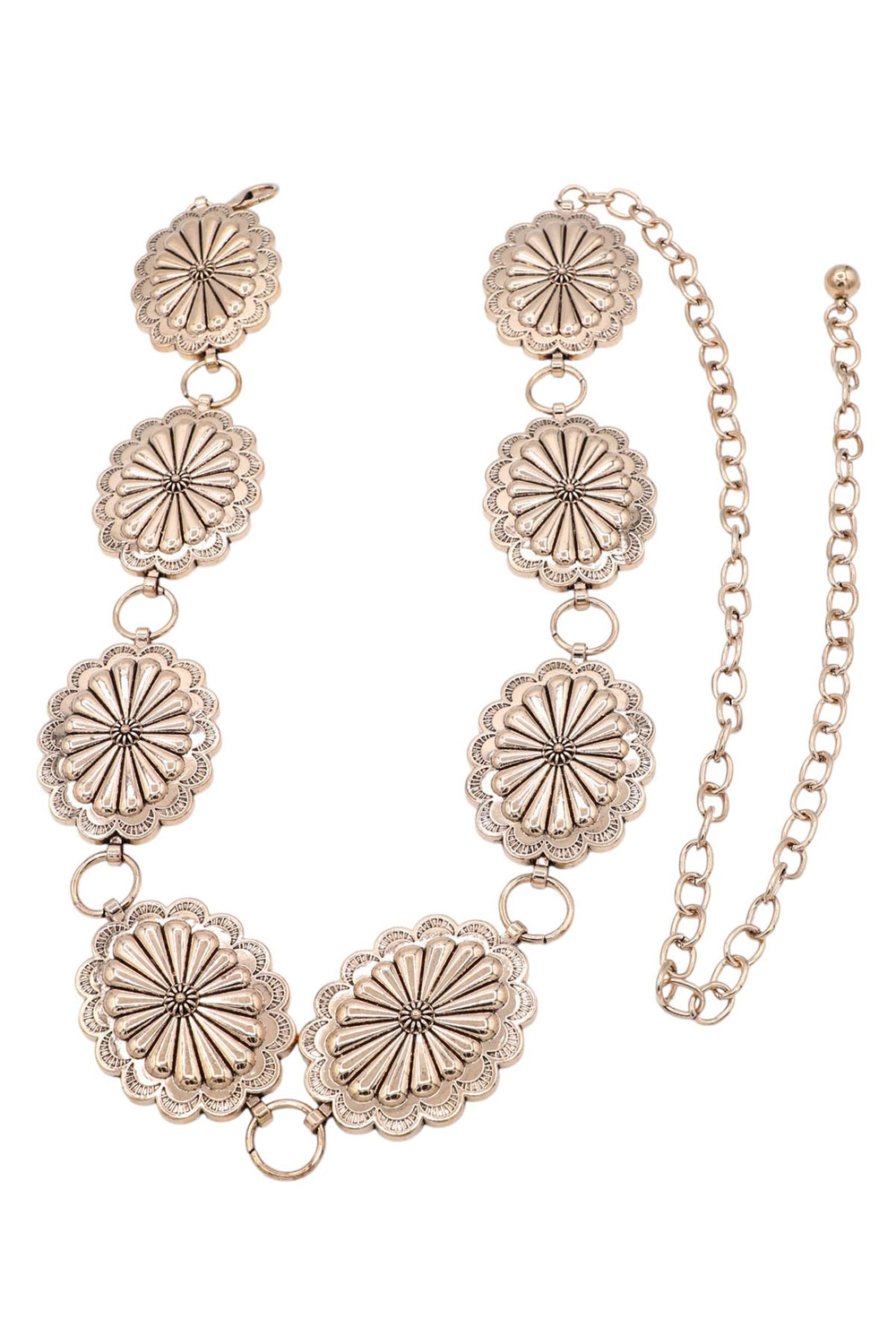 - This Western-inspired belt features oval florette conchos linked by a sleek chain. A versatile accessory that adds rustic charm to dresses, denim, or skirts.