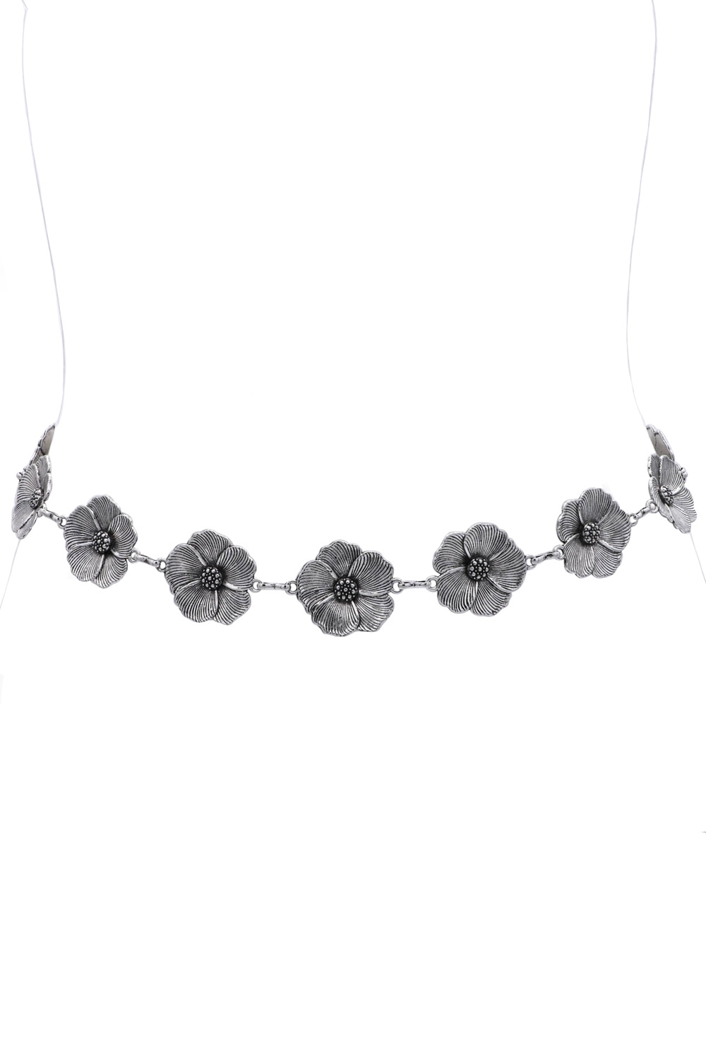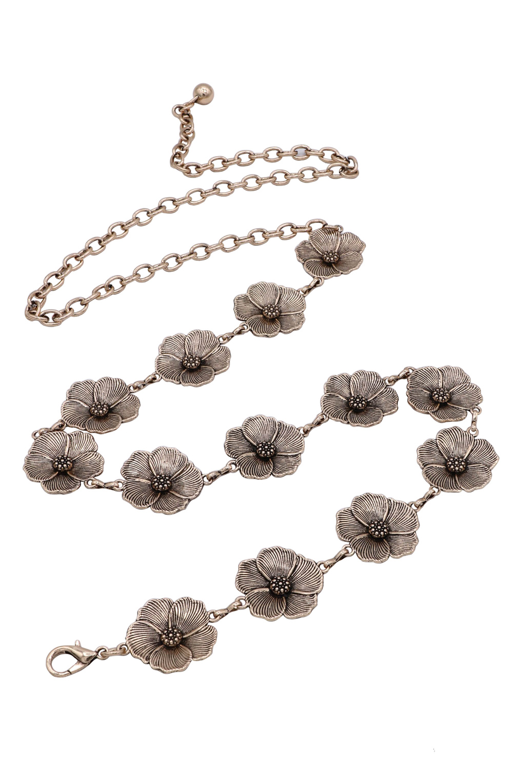 - Charming and vintage-inspired, this metal chain belt showcases delicate floral links that add a feminine and elegant touch to any outfit.
