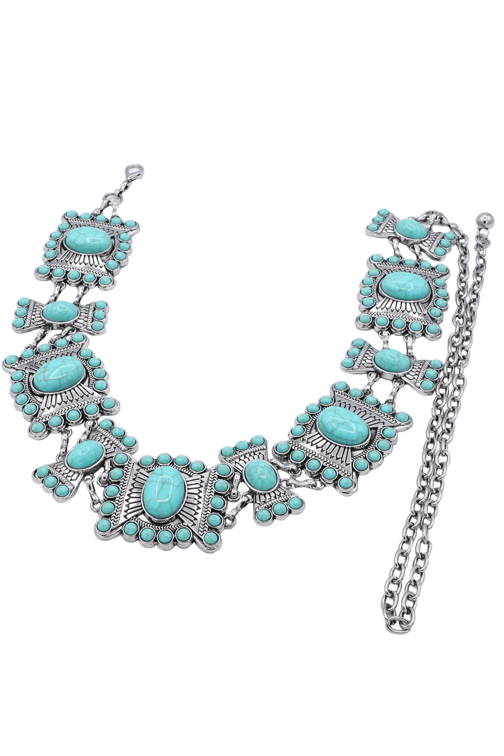 - A unique chain belt adorned with Southwestern-style butterfly conchos and colorful CAB accents, adding a playful yet elegant touch to dresses, denim, or festival looks.