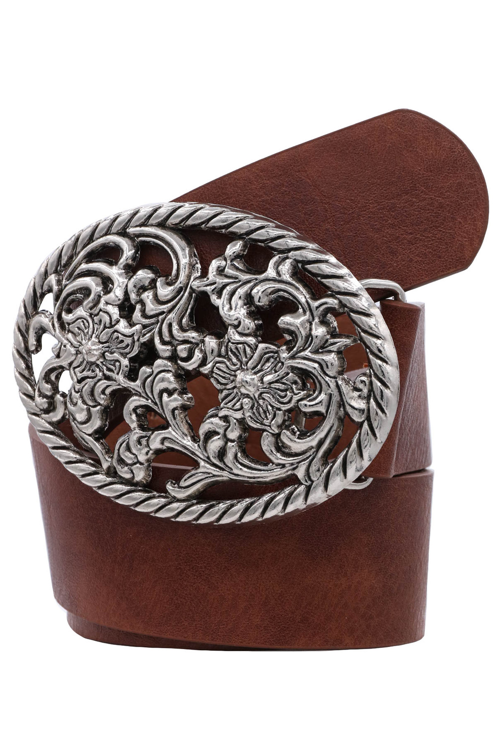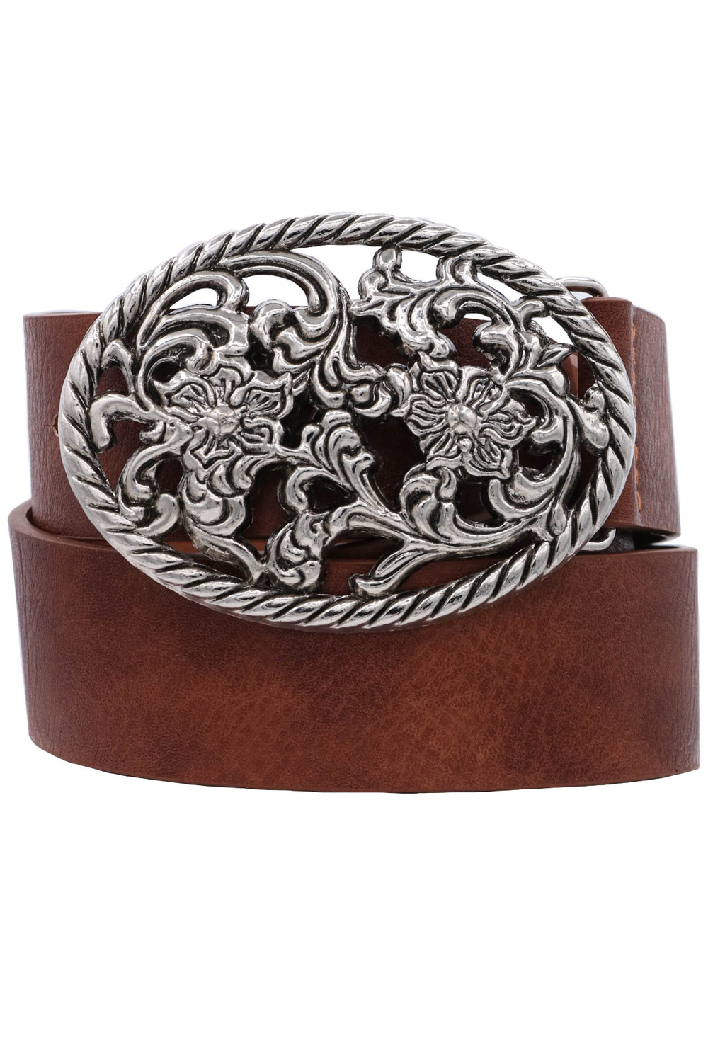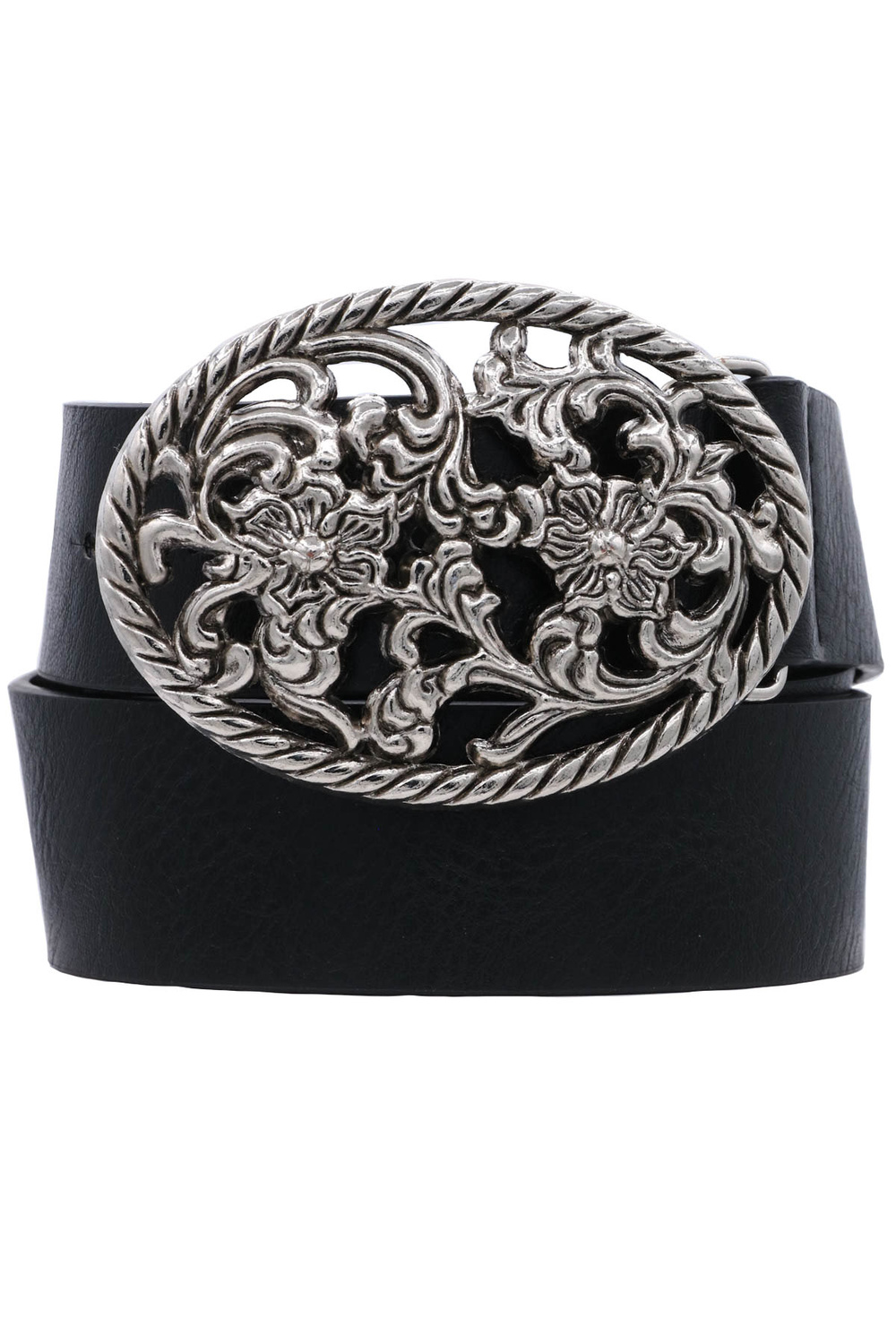 • Faux leather floral filigree oval buckle belt