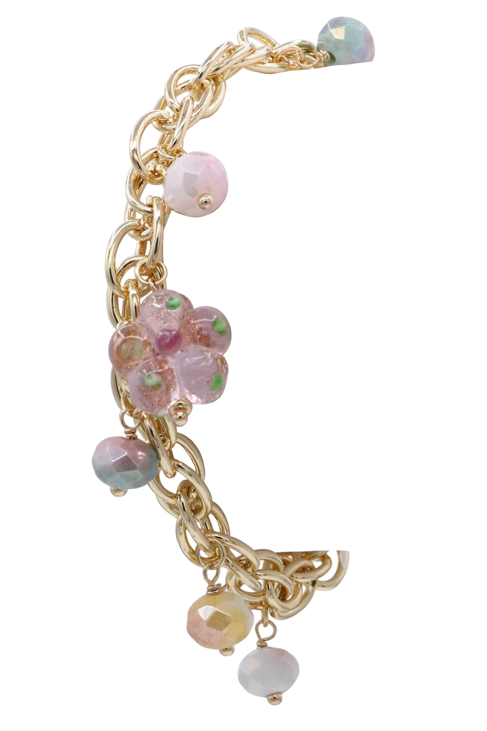 - This exquisite bracelet is a captivating blend of delicate charm and modern sophistication. The foundation is a beautifully crafted gold-tone chain, featuring interlocking links that offer a substantial yet elegant presence on the wrist. Each bead catches the light, creating a subtle shimmer that adds depth and dimension to the piece.