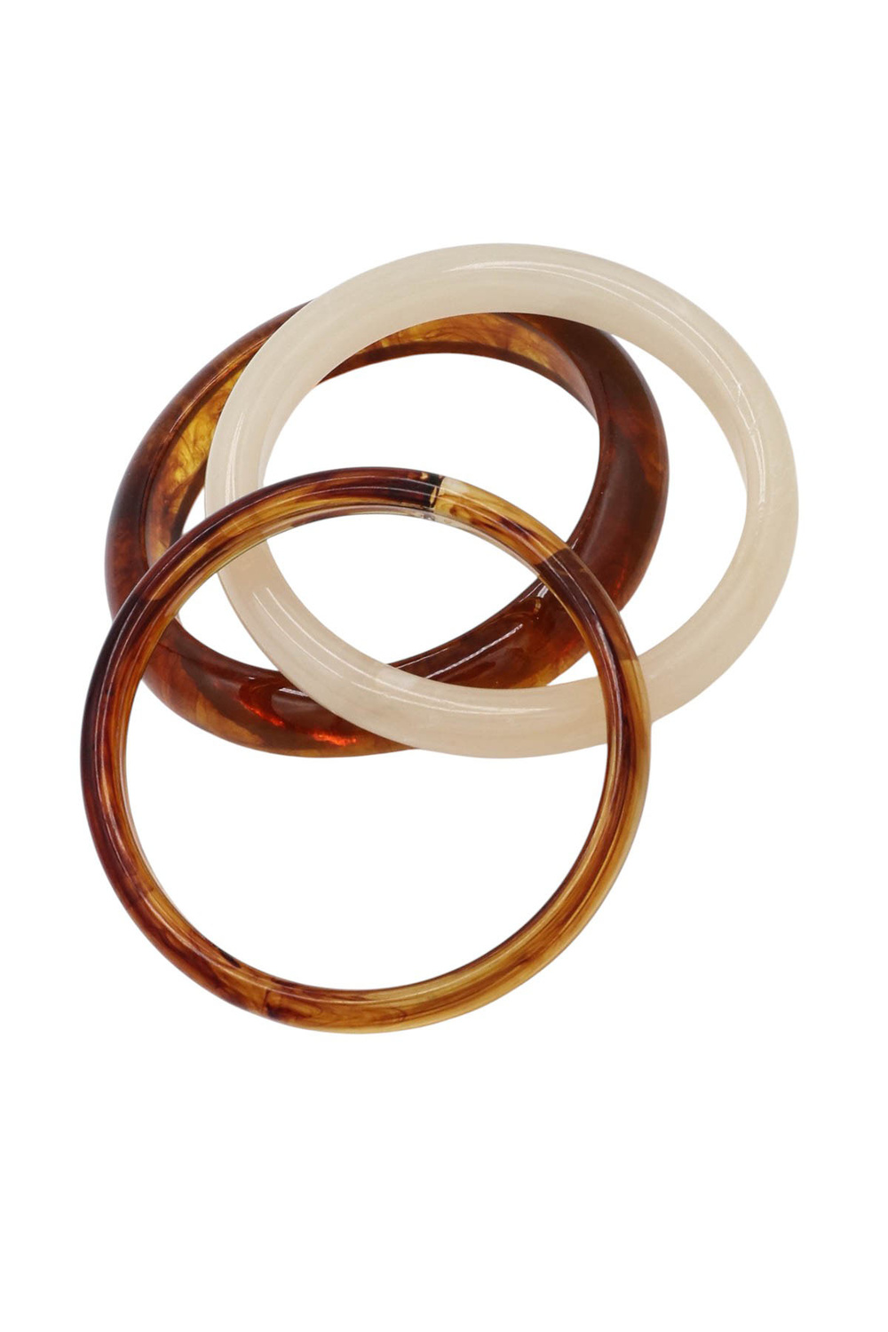 - Chic resin layered bracelet set featuring three stackable bracelets in complementary colors. Modern, fun, and ideal for mixing and matching with other accessories.