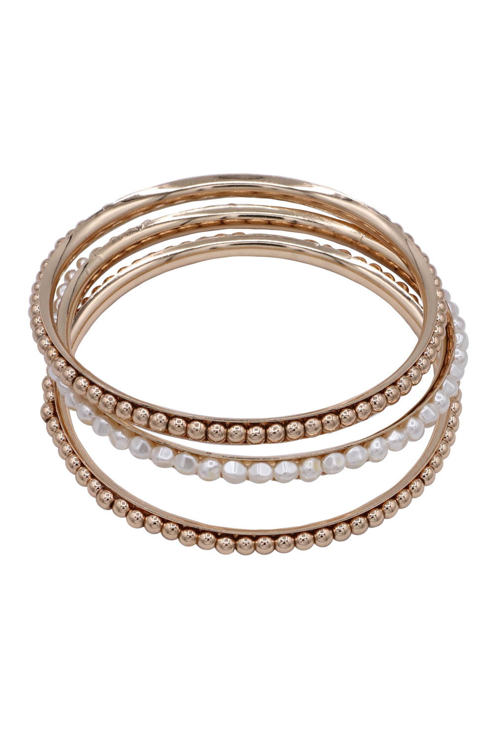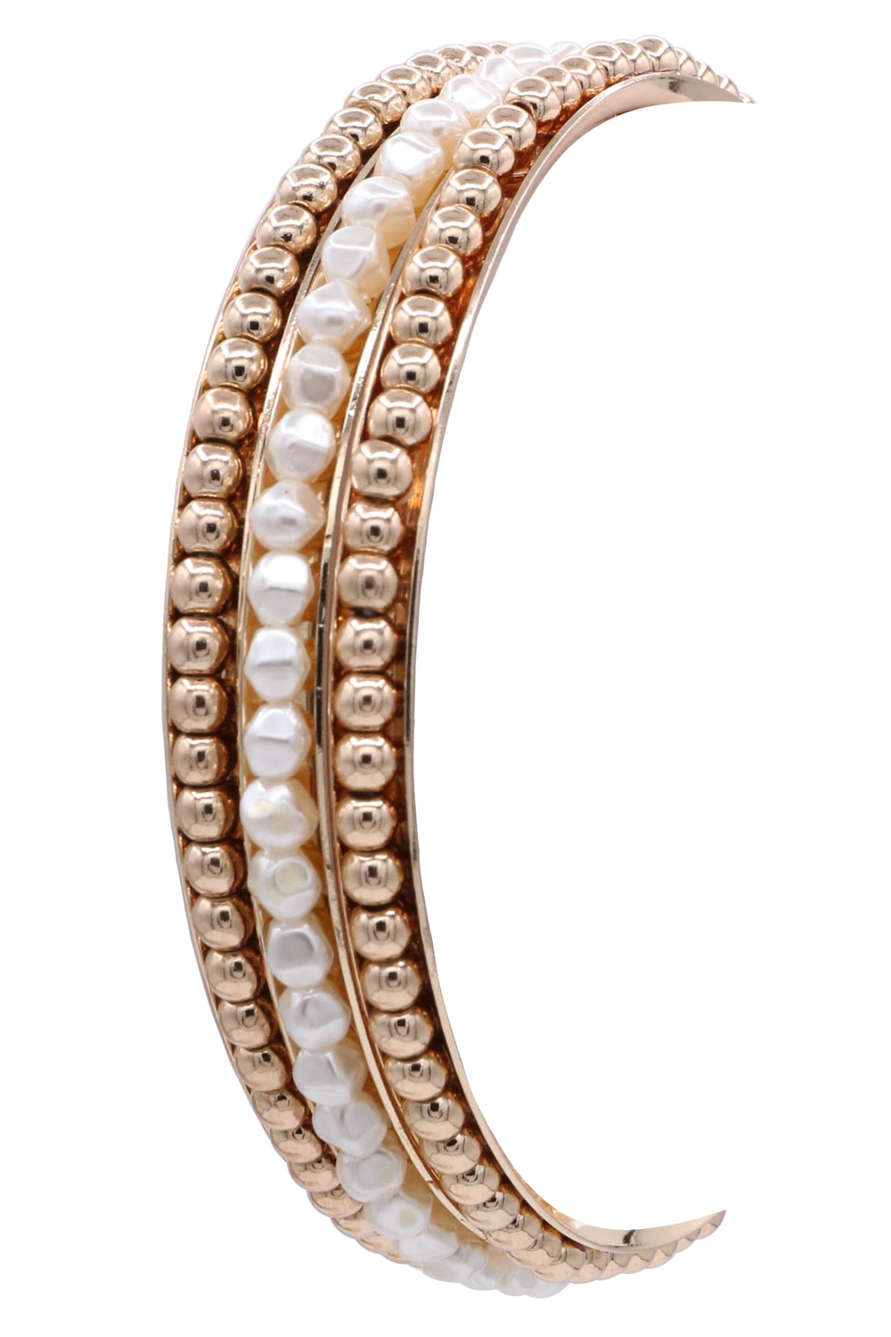 - This exquisite cuff bracelet is a symphony of classic elegance and contemporary style, meticulously crafted to adorn the wrist with timeless sophistication. It features a captivating design composed of three distinct bands, each offering a unique textural and visual appeal. The interplay of textures, the rich gold tones, and the classic appeal of pearls ensure this piece remains a cherished accessory for years to come.