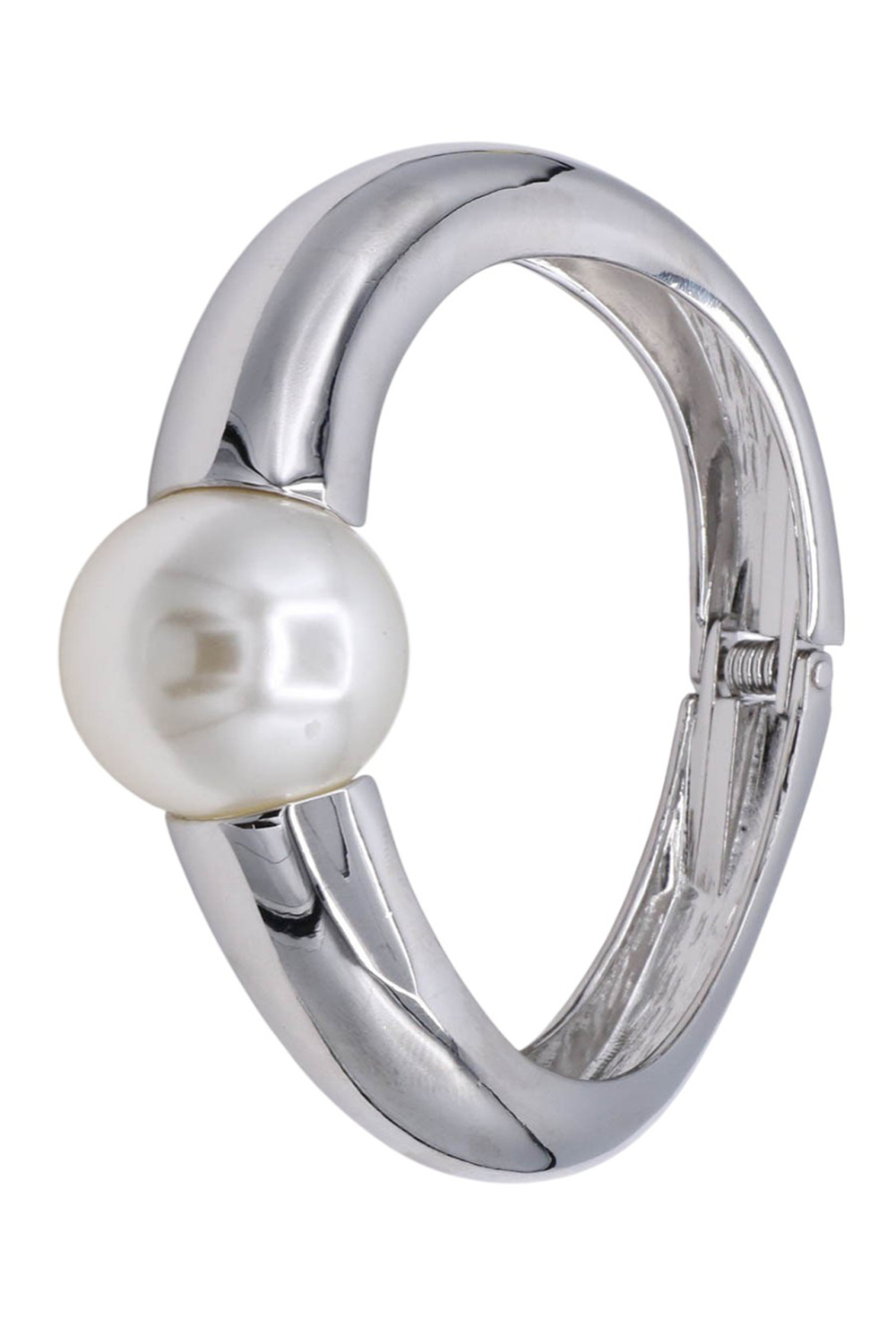 - A stylish bangle bracelet featuring faceted metal details accented with a classic pearl centerpiece. Designed with a hinge closure for easy wear, this elegant piece adds texture and sophistication to any look.