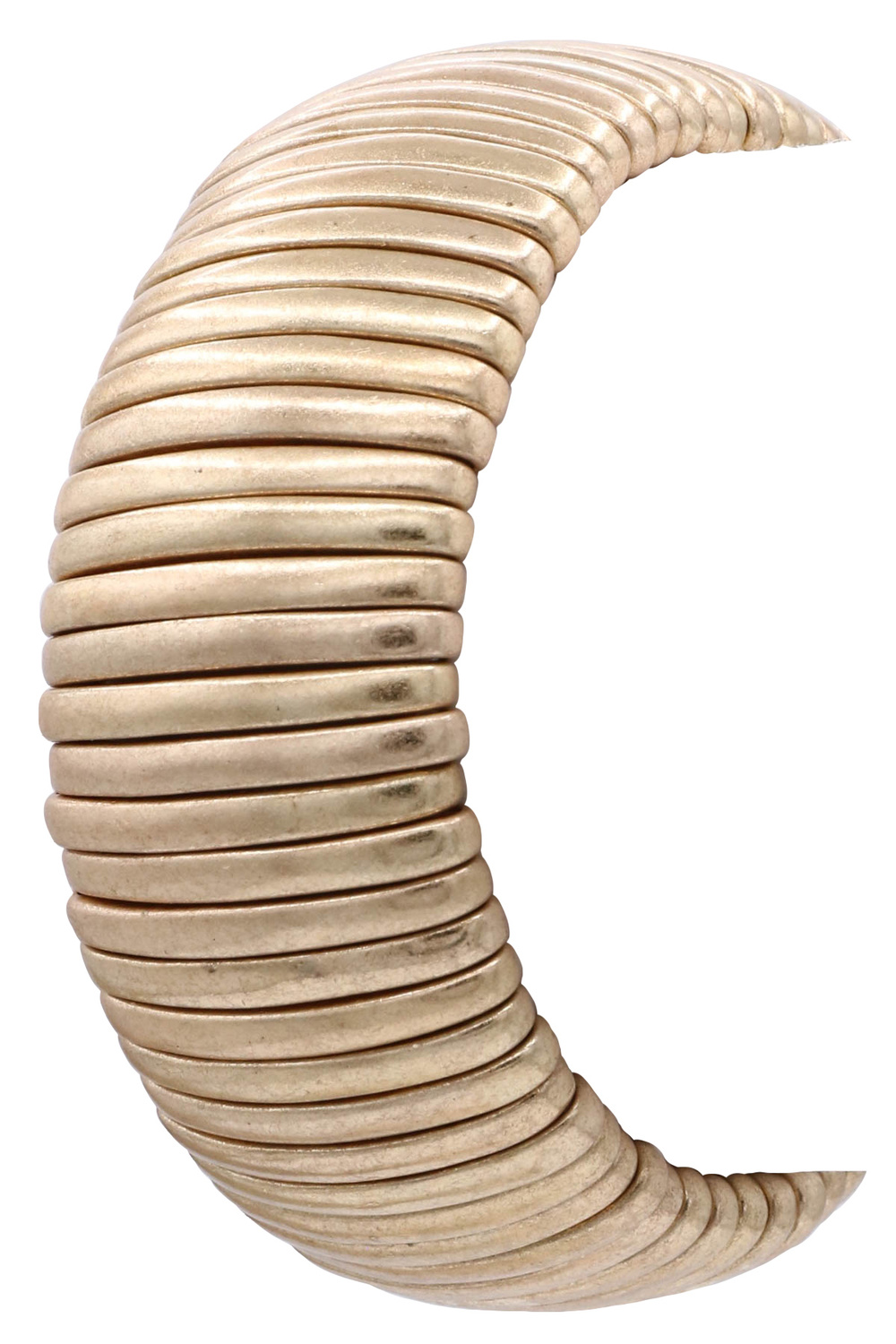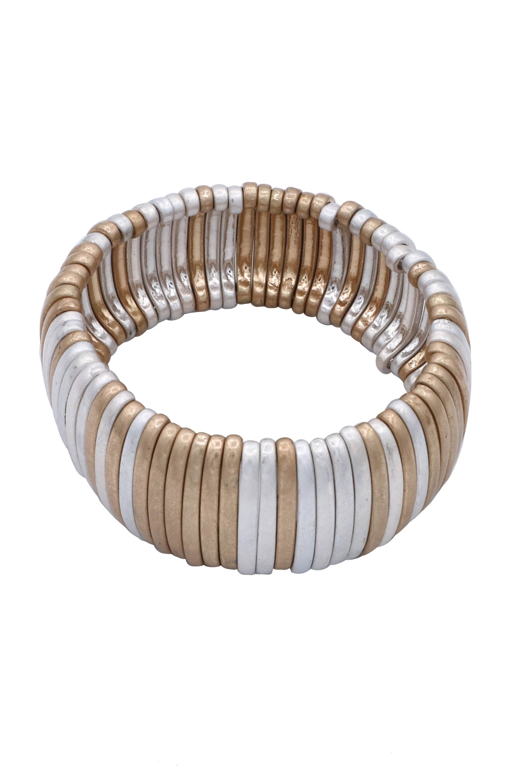 - This stylish stretch bracelet showcases textured ribbed metal detailing for a contemporary, boutique-inspired accessory.