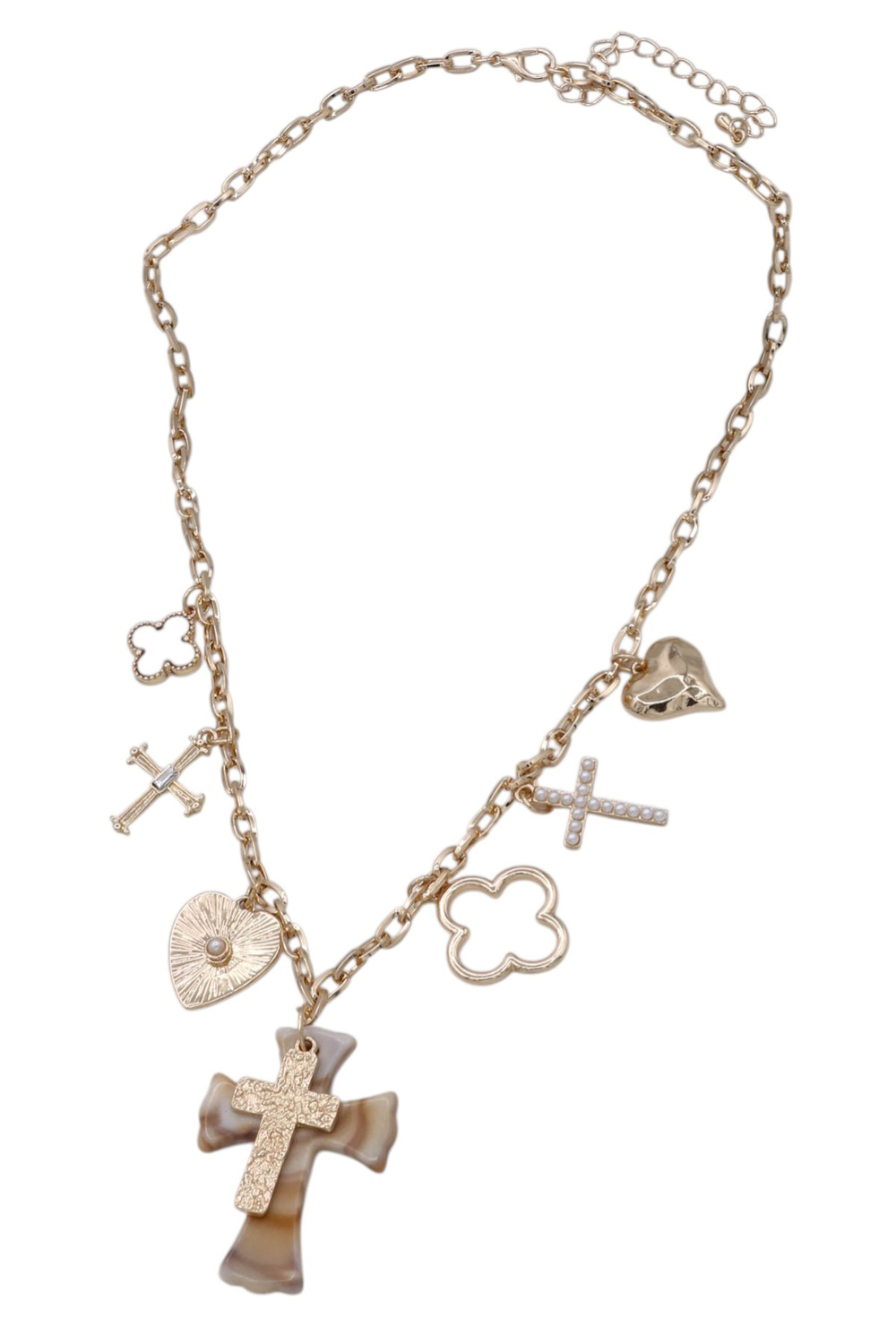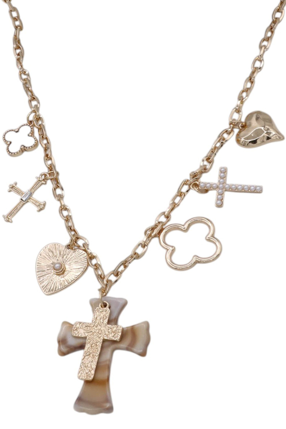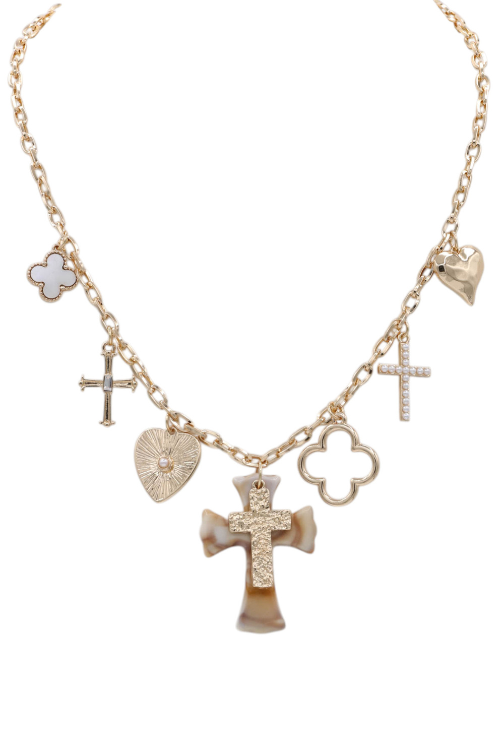 • A charming necklace featuring a mix of cross, heart, and clover charms on a sleek chain. Playful yet stylish, perfect for layering or wearing solo as a meaningful statement piece.
