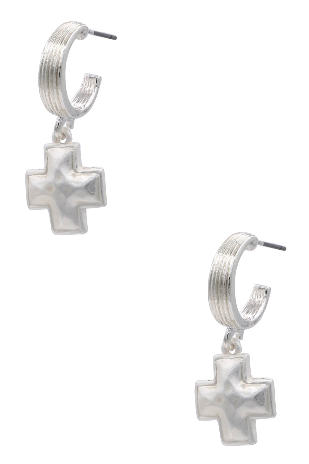 • Classic hoop earrings accented with a sleek metal cross charm. A timeless design that blends everyday style.