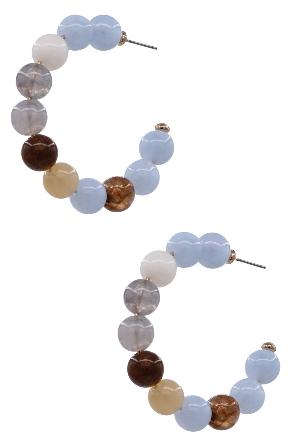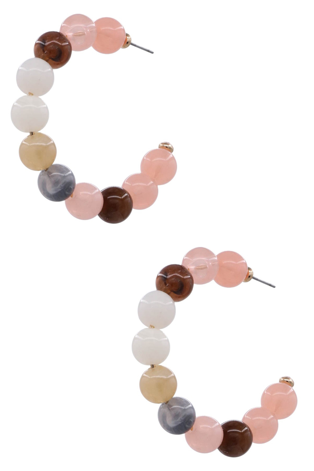 - Bright and playful, these acrylic hoop earrings feature multi-color beads that add cheerful charm to any outfit. Perfect for casual days or vacation looks.