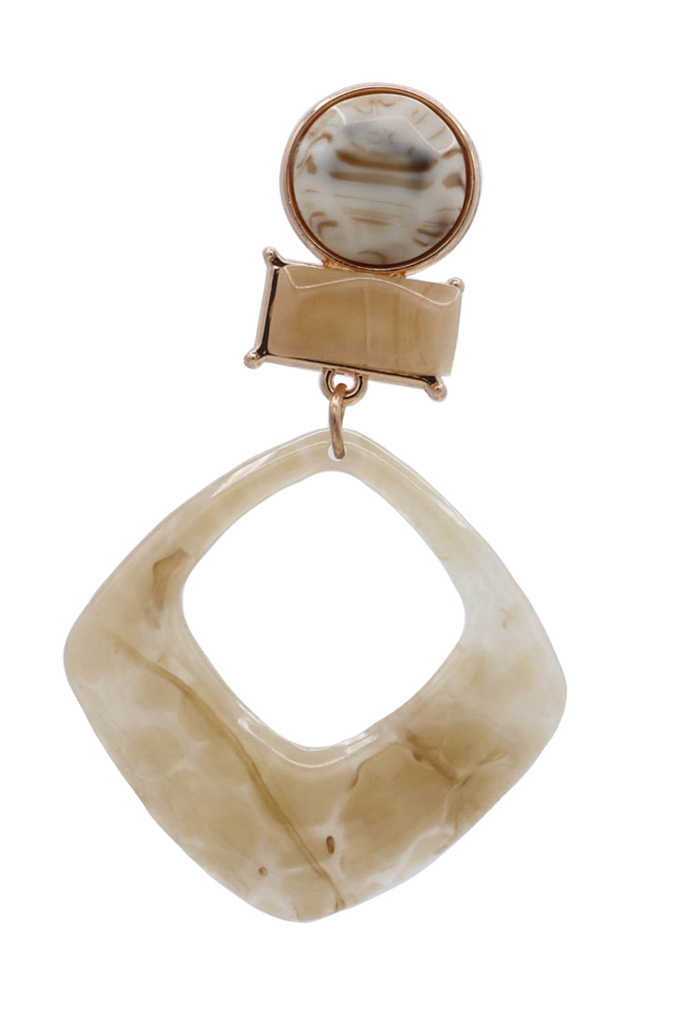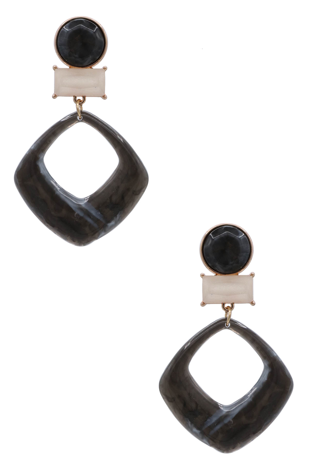 - Dangle earrings featuring three layered geometric resin shapes. Lightweight with bold visual impact.