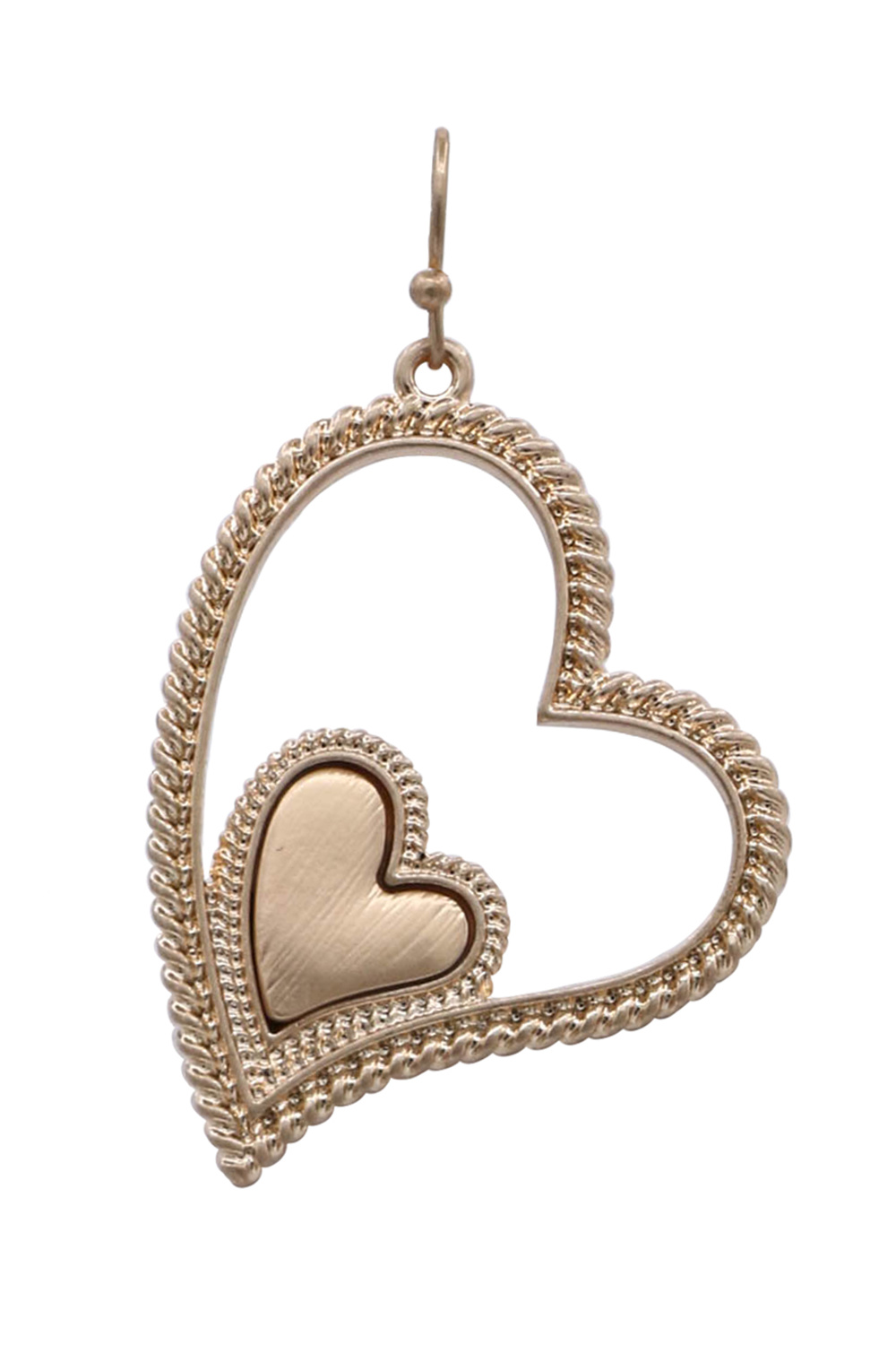 - Chic and romantic, these earrings showcase a duo of textured metal hearts for a bold yet elegant statement. Perfect for casual or dressy outfits.