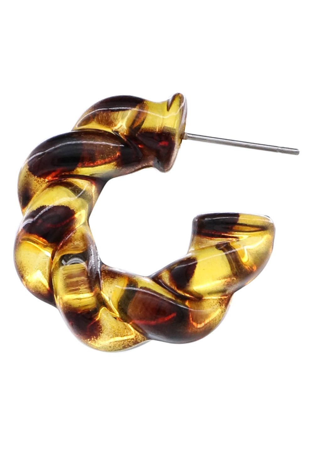 - Featuring a unique twisted design, these tortoise resin hoop earrings add a stylish texture and timeless pattern to any outfit. Lightweight and versatile, perfect for day-to-night wear.