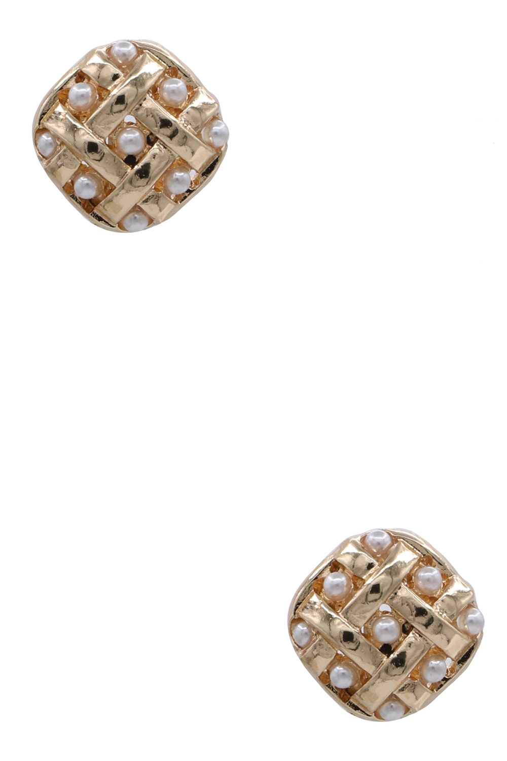 - Square post earrings accented with cream pearls in a pavé setting. Elegant and lightweight for everyday wear.