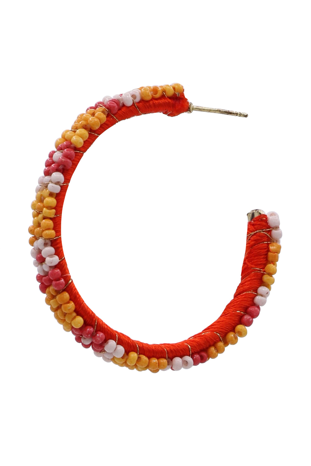 - These vibrant hoop earrings are a playful and stylish accessory, perfect for adding a pop of color to any outfit. The earrings feature a bright orange thread base, meticulously woven to create a sturdy and eye-catching foundation. The vibrant colors and intricate design make them a standout piece that will elevate any outfit.