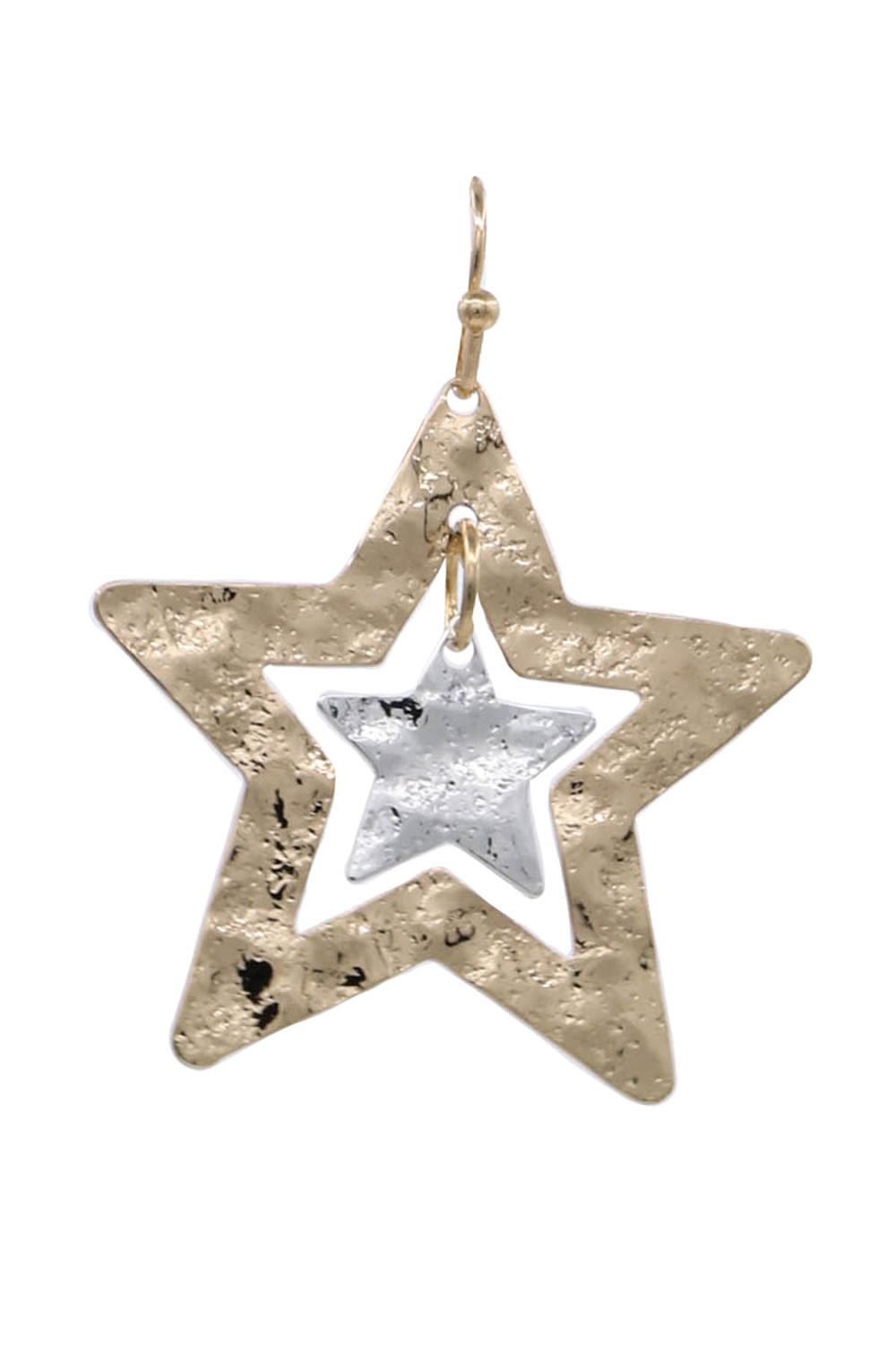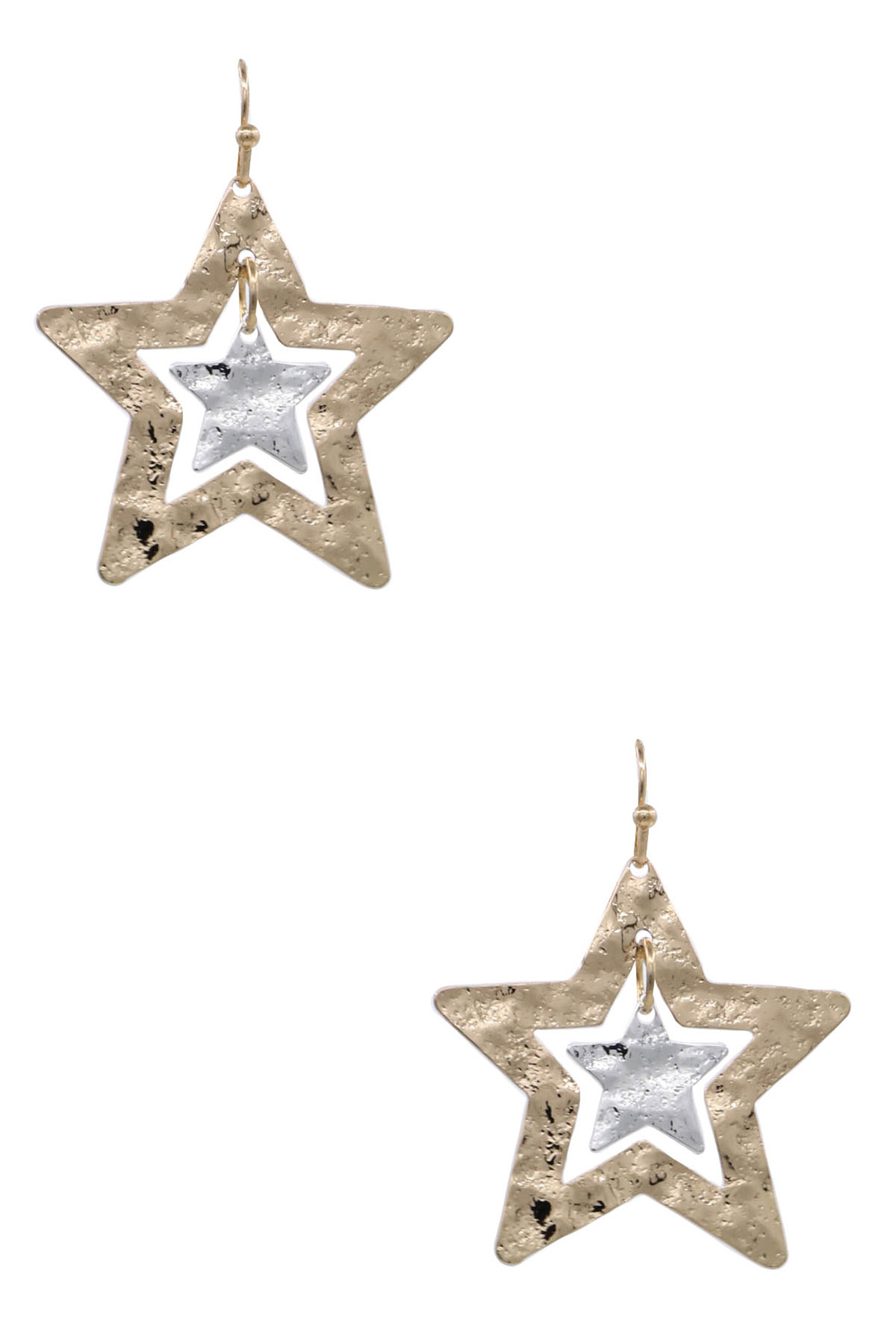 - Stylish drop earrings featuring layered hammered metal stars. A modern and chic accessory that adds sparkle and dimension to any outfit.