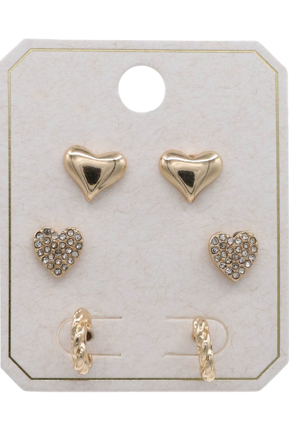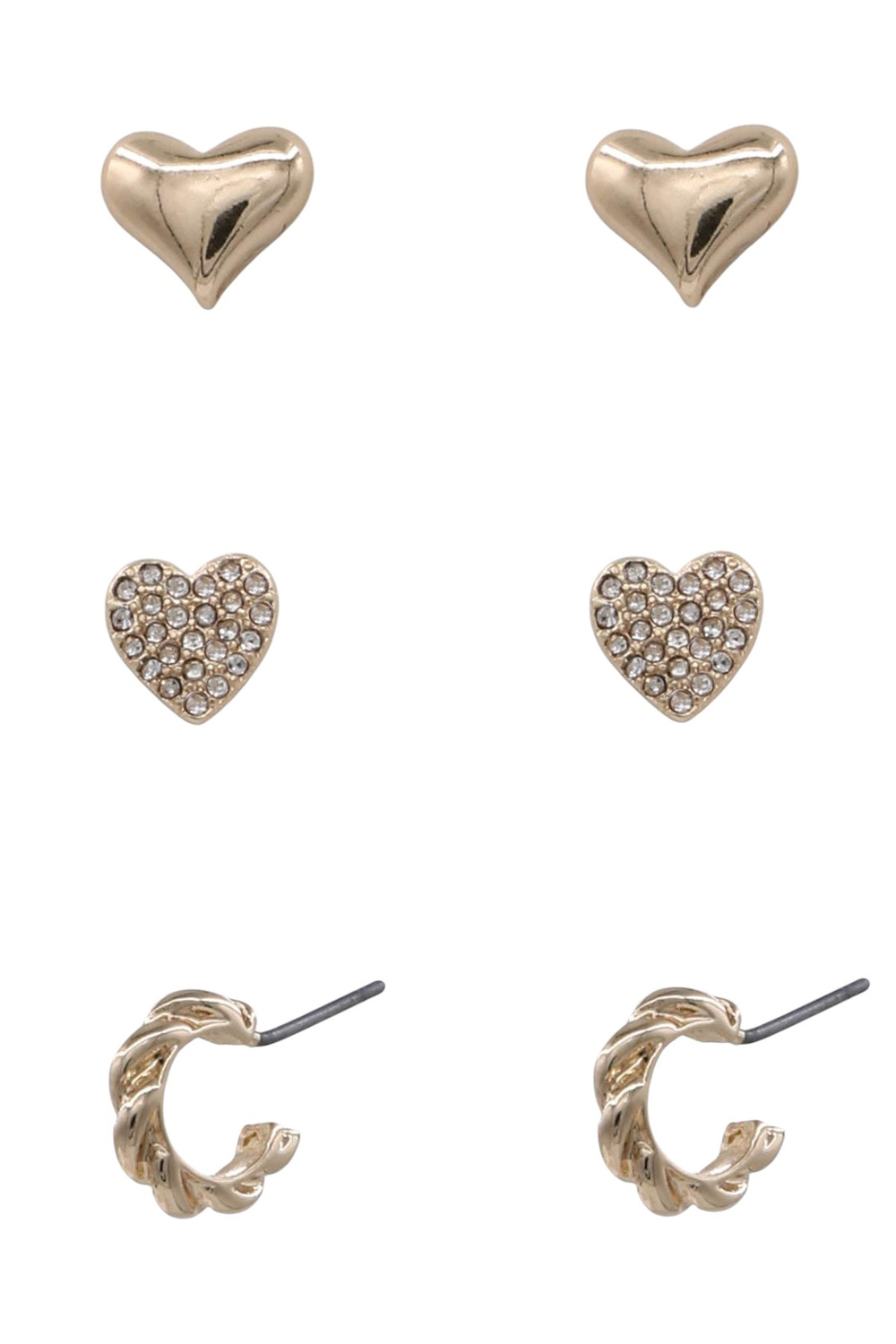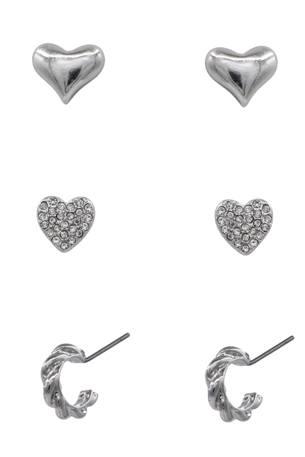 - Charming and elegant, this trio earring set includes classic metal heart a rhinestone heart studs and twisted hoop earring set.