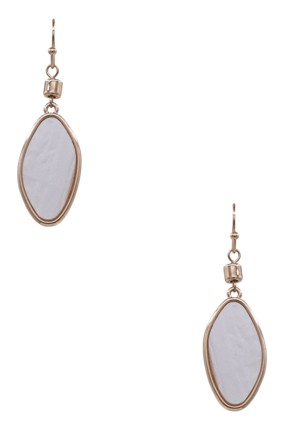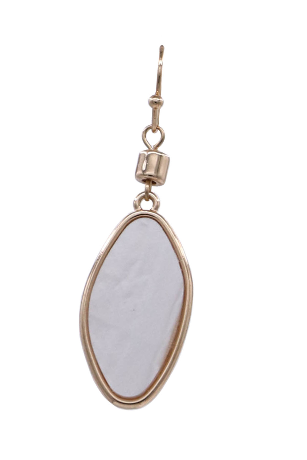 - Sleek bent oval drop earrings combining textured metal with radiant mother of pearl. A timeless accessory for everyday wear or special events.