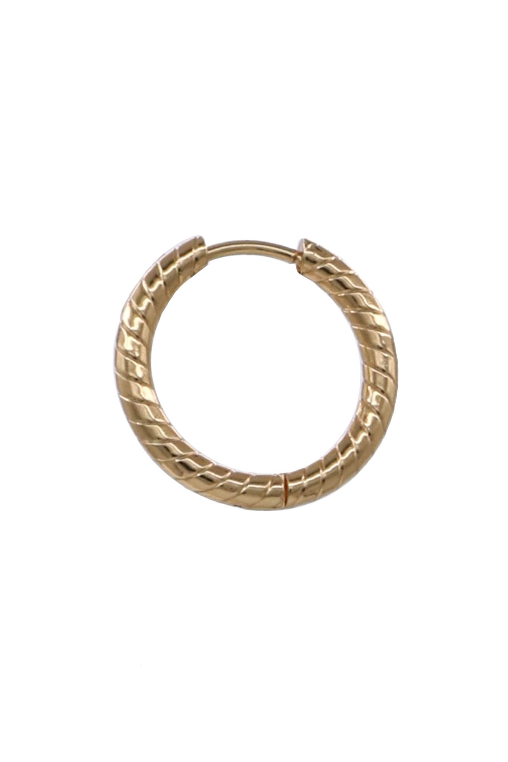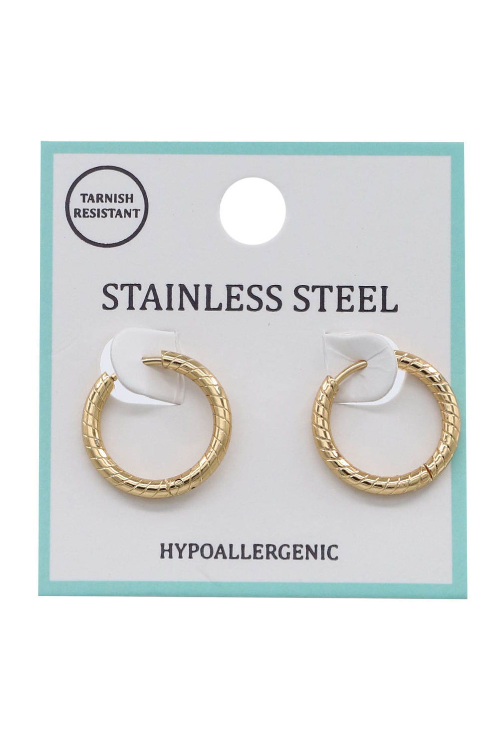 - Classic huggie hoop design enhanced with a refined textured pattern in stainless steel. A versatile accessory for casual or formal wear.