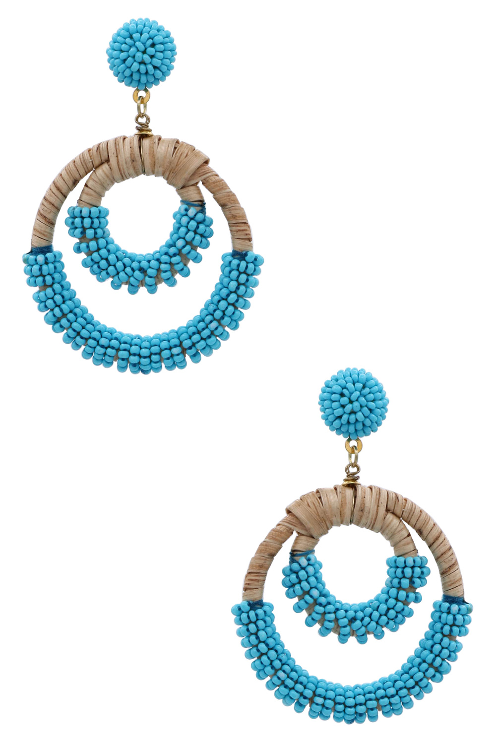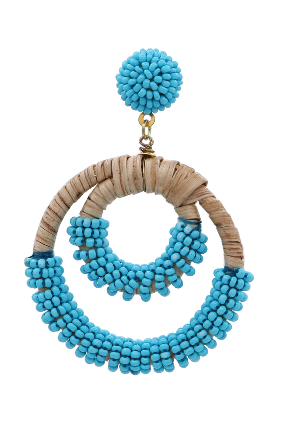 - These stunning drop earrings are the perfect statement piece for any bohemian-inspired outfit. The earrings feature a unique design with a woven raffia circle and beaded ivory accents. These earrings are a true work of art and are sure to become a cherished piece in your jewelry collection. With their versatile design and timeless appeal, these earrings are sure to be a favorite for years to come.