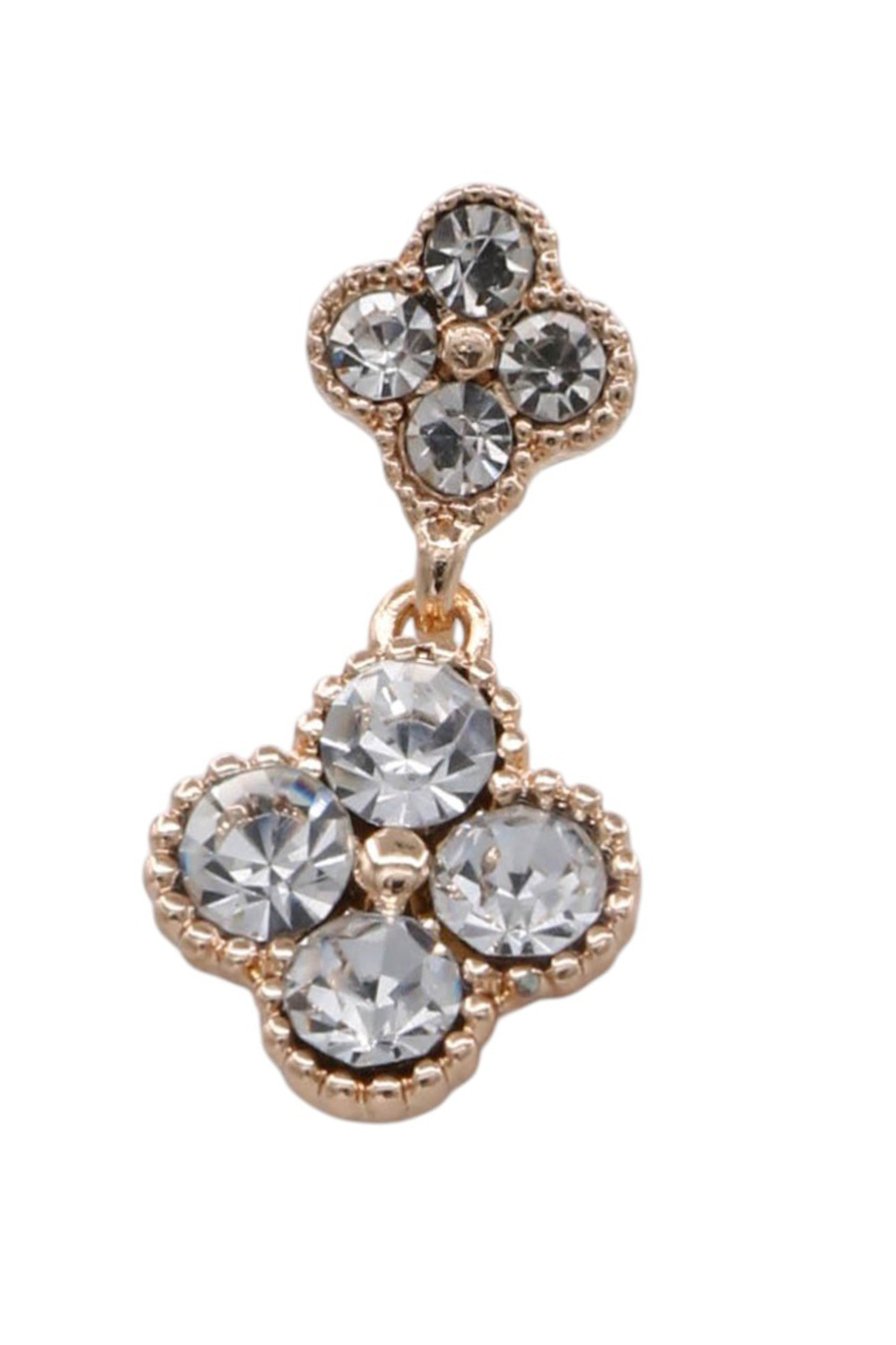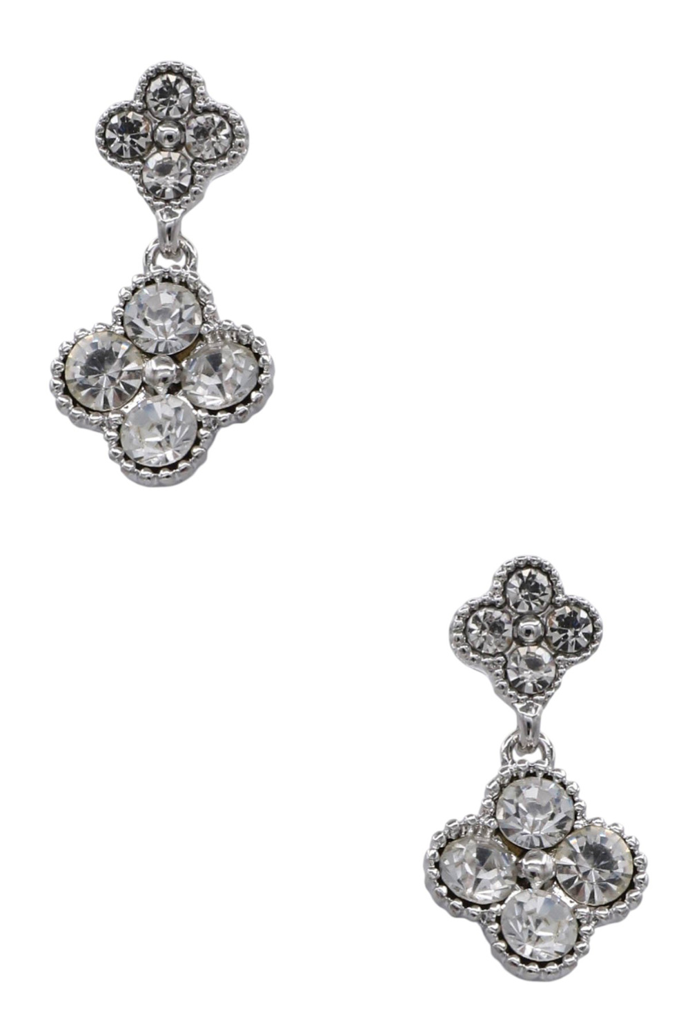 - Elegant and eye-catching, these metal dangle earrings showcase a classic quatrefoil design adorned with shimmering pavé stones for a sophisticated look.
