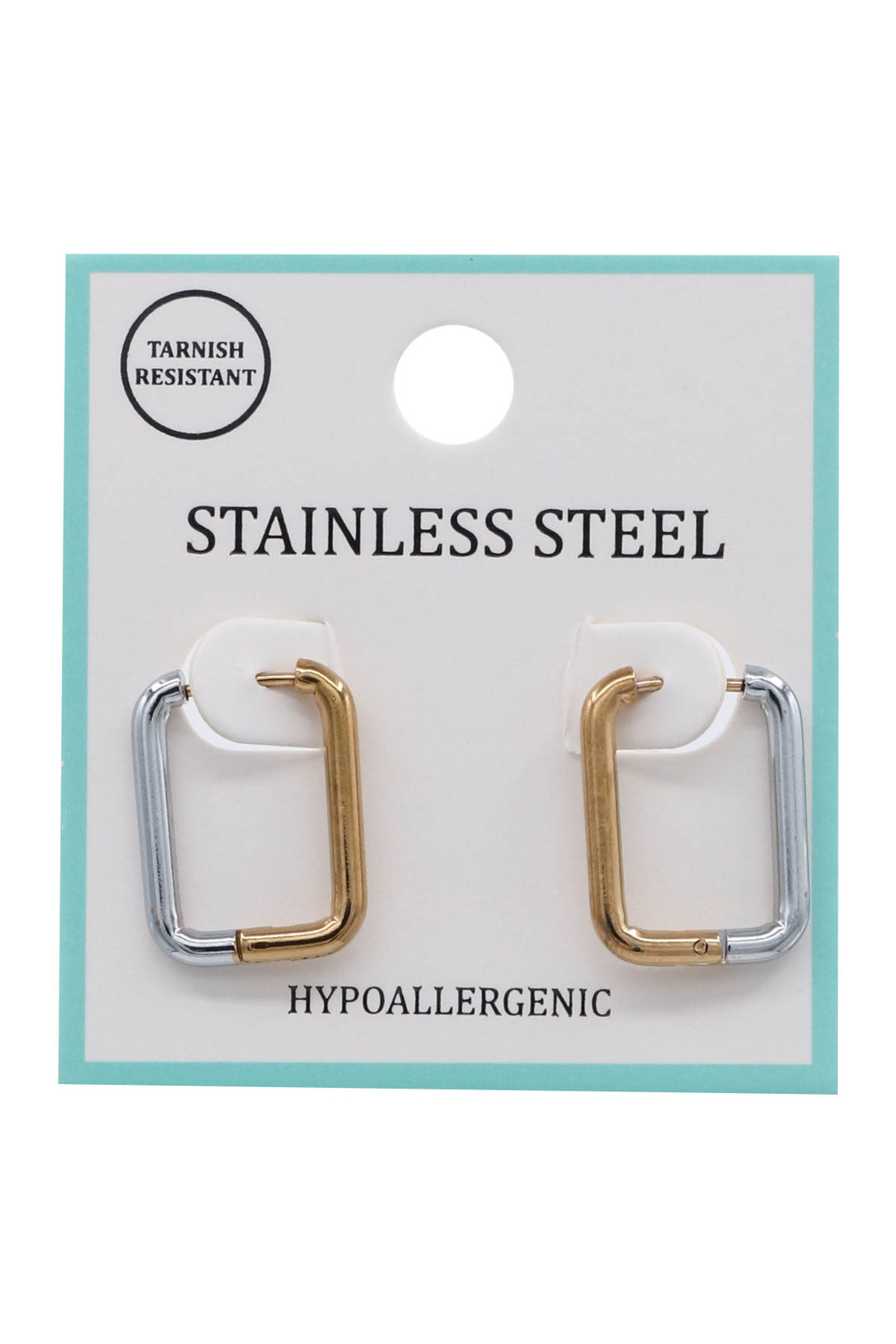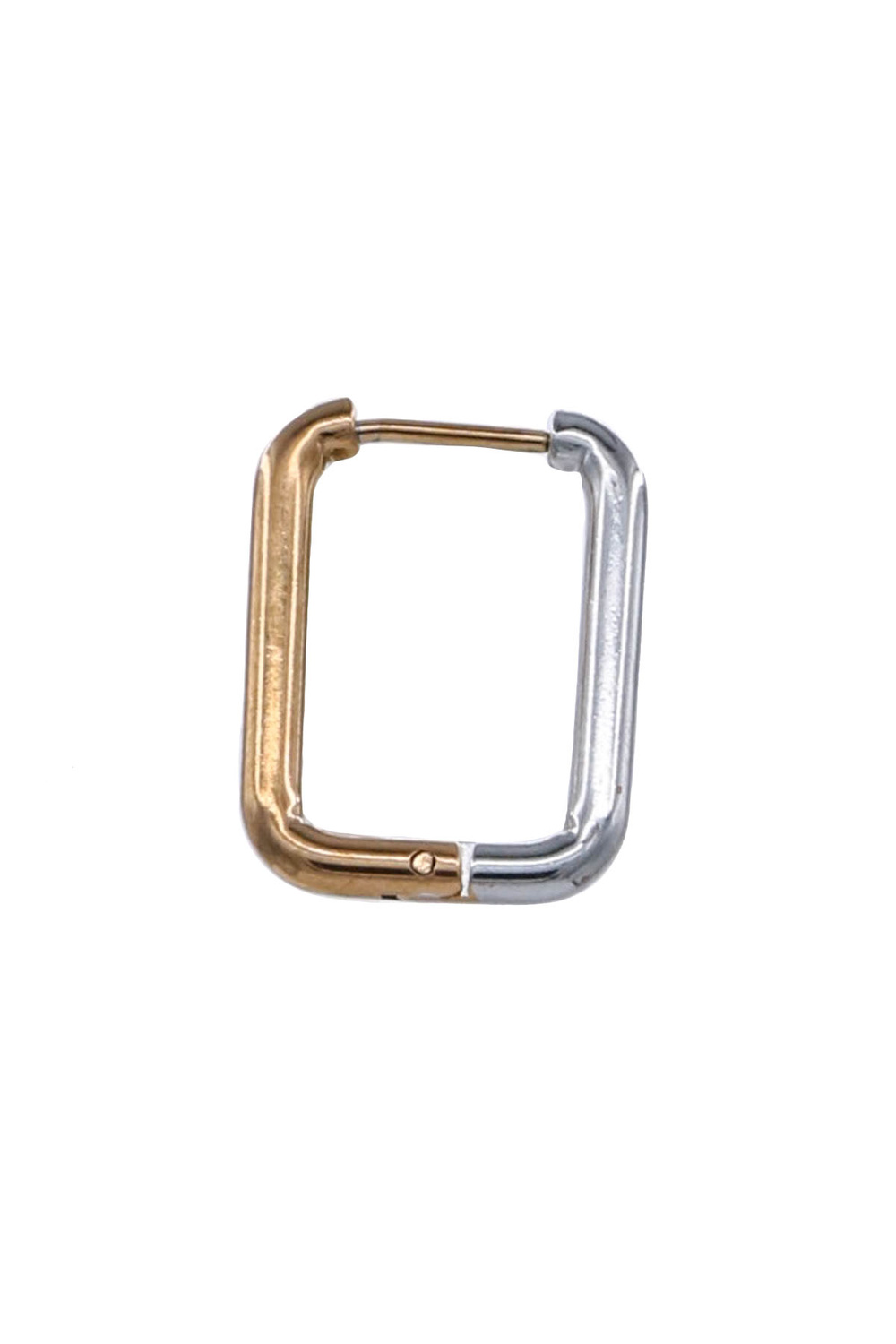 - Contemporary two-tone huggie hoops in a rectangular shape for a bold yet refined look. Ideal for both casual and dressy occasions.