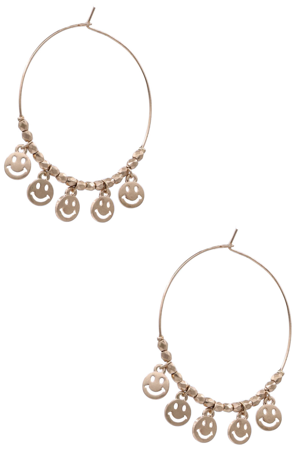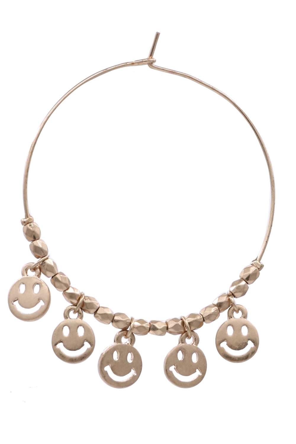 - Bring on the good vibes! These chic metal hoops feature a playful smiley face charm that adds a touch of fun to any look.