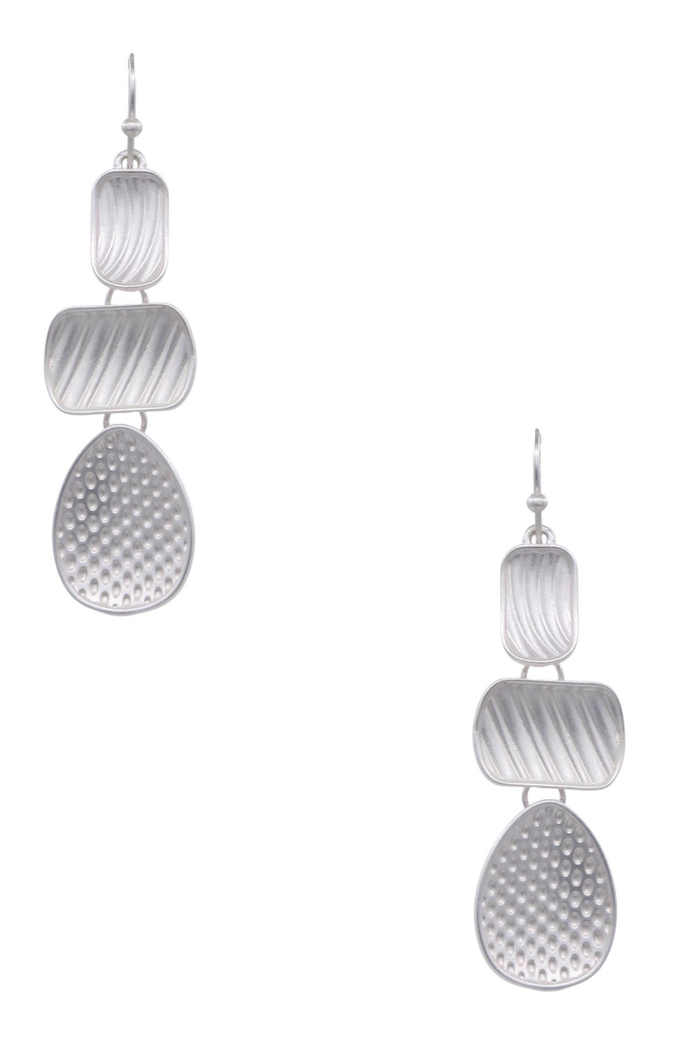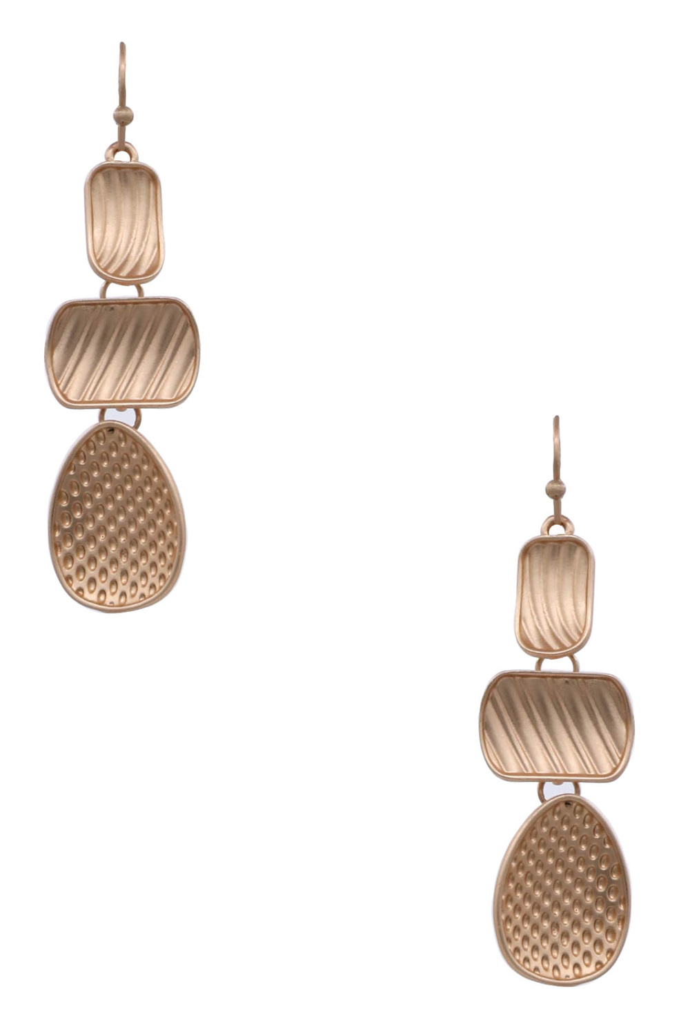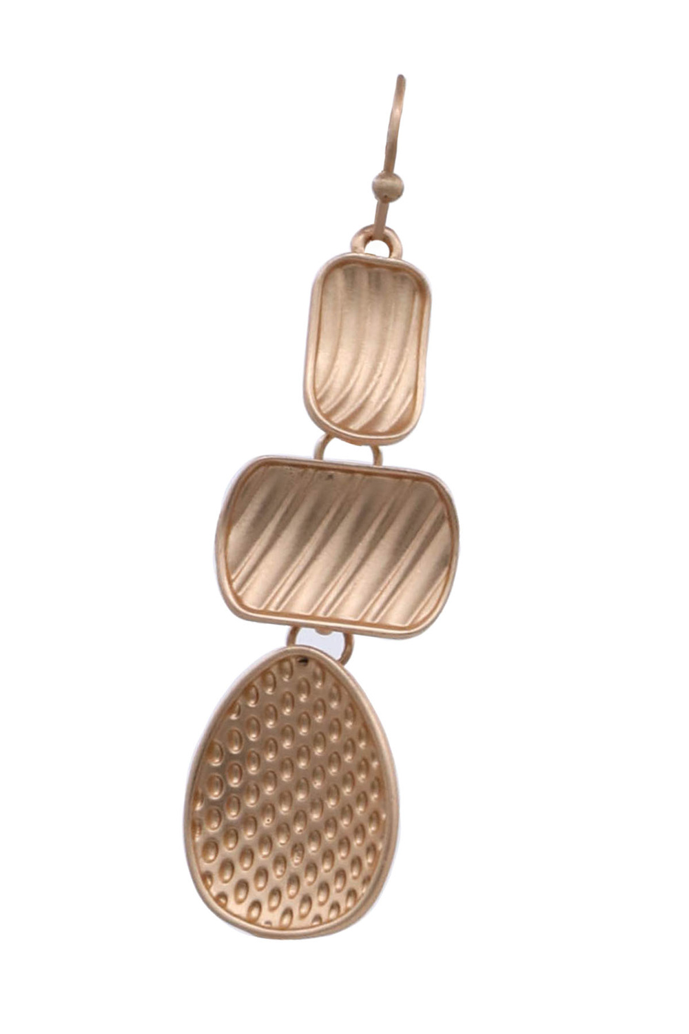 - Stylish drop earrings featuring three linked metal shapes with unique textured finishes.