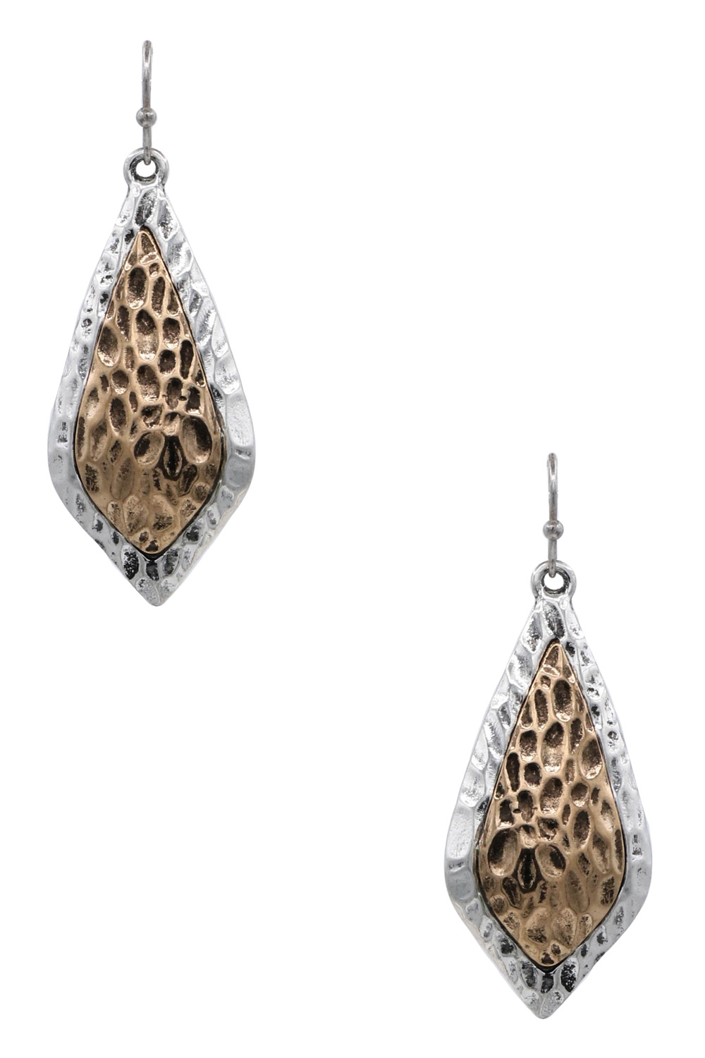 - Dangle earrings featuring hammered teardrop shapes in a two-tone finish. Lightweight with a modern, elegant look.