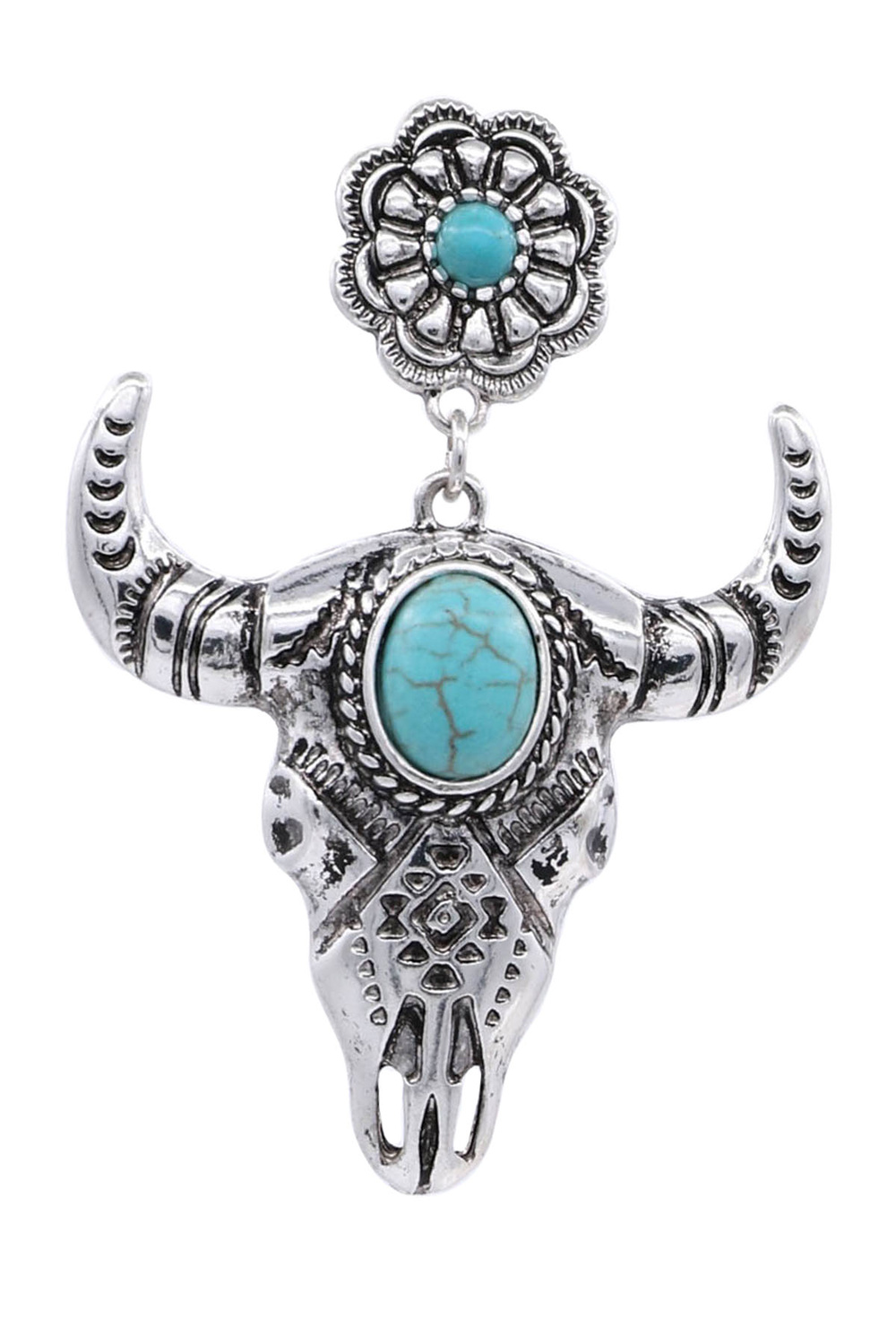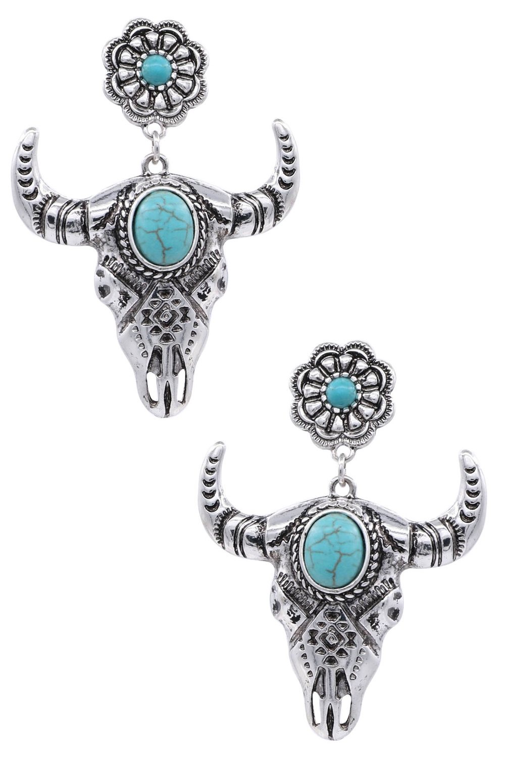 • These Western-inspired earrings feature a bold bull skull accented with delicate floral prints and topped with a turquoise dome stone.