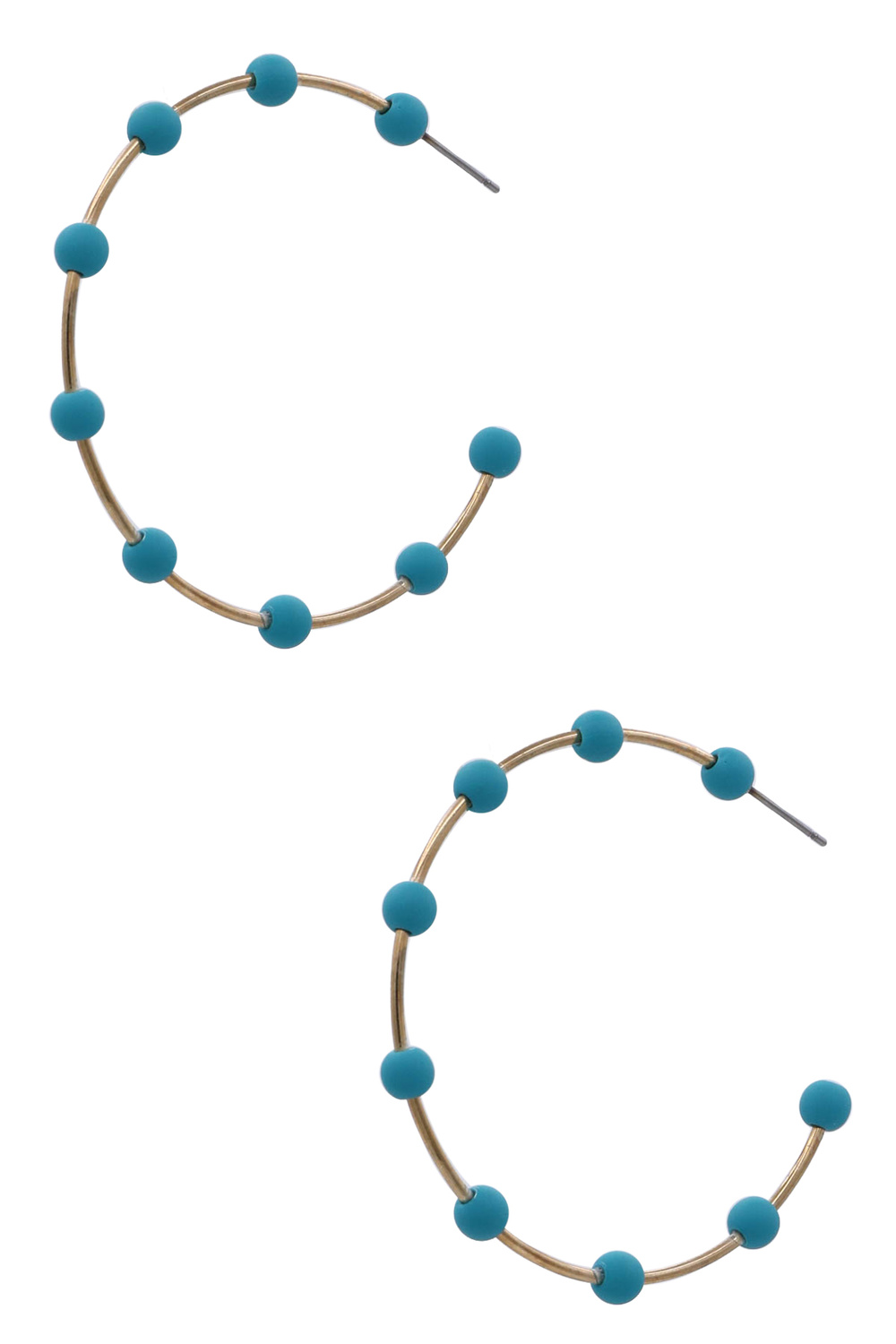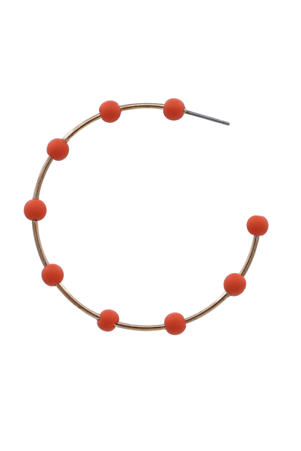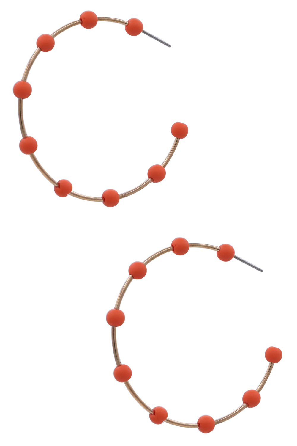 - These exquisite gold-tone hoop earrings are adorned with a captivating series of turquoise and orange beads, creating a vibrant and eye-catching accessory. The delicate gold hoops provide a classic framework, while the strategically placed beads add a playful pop of color and a touch of bohemian charm.