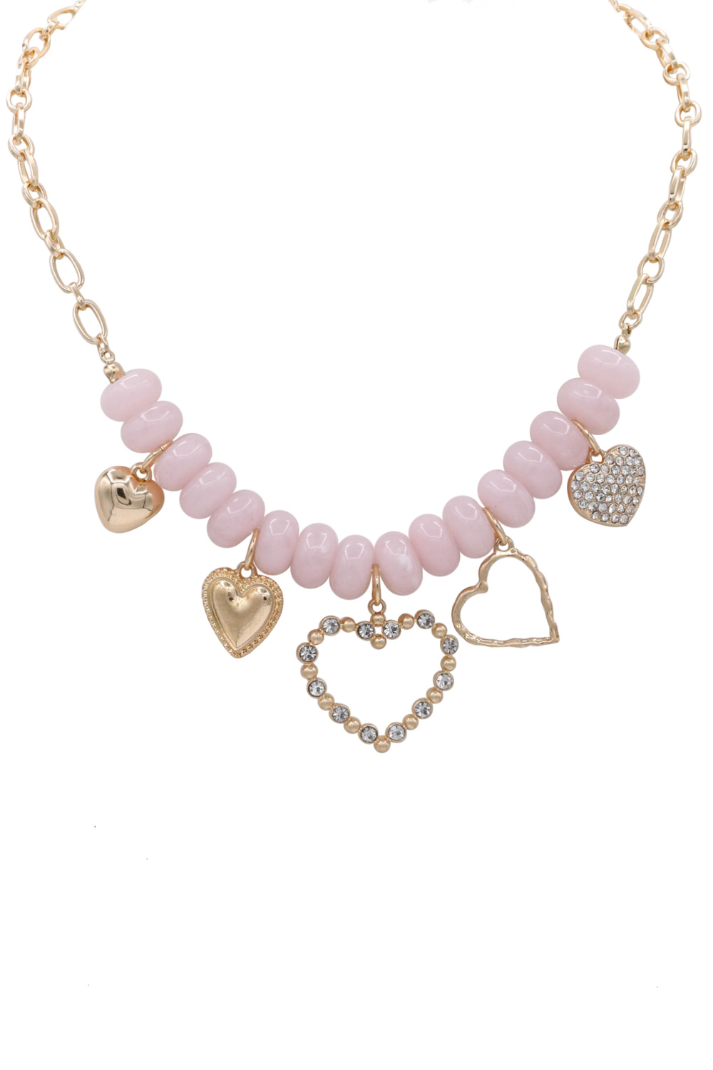 • Chic and playful, this necklace combines metal chain links with acrylic beads and heart charms for a trendy, romantic look. Ideal for layering or wearing solo.