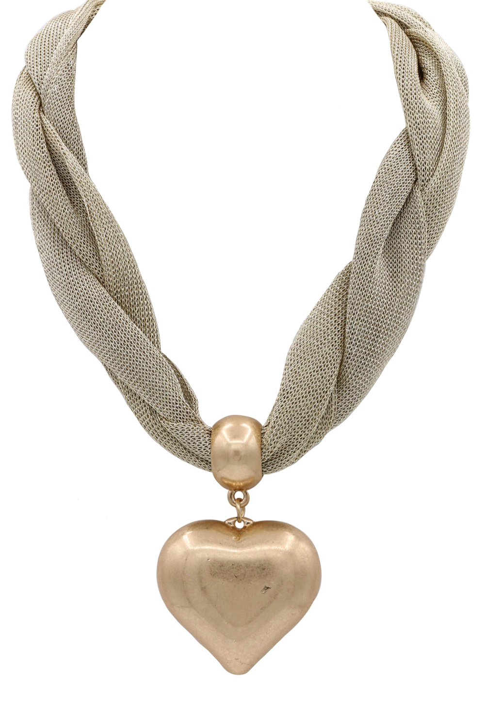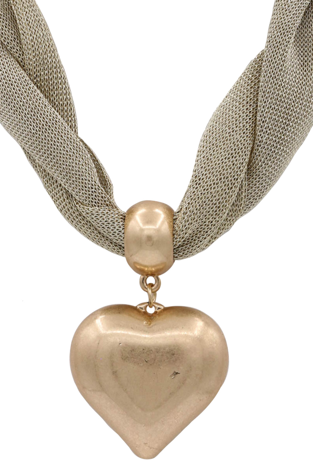 • This statement necklace features a soft metallic mesh fabric paired with a striking heart pendant. A chic blend of texture and shine for standout styling.