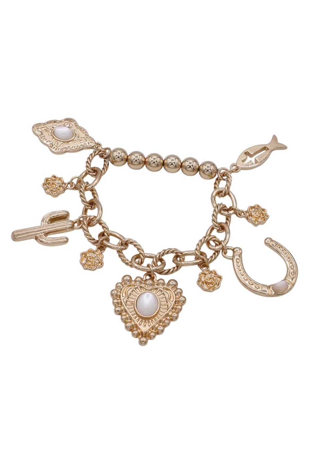 - Metal bracelet featuring western charms and a horseshoe accent. A rustic western piece perfect for everyday wear.