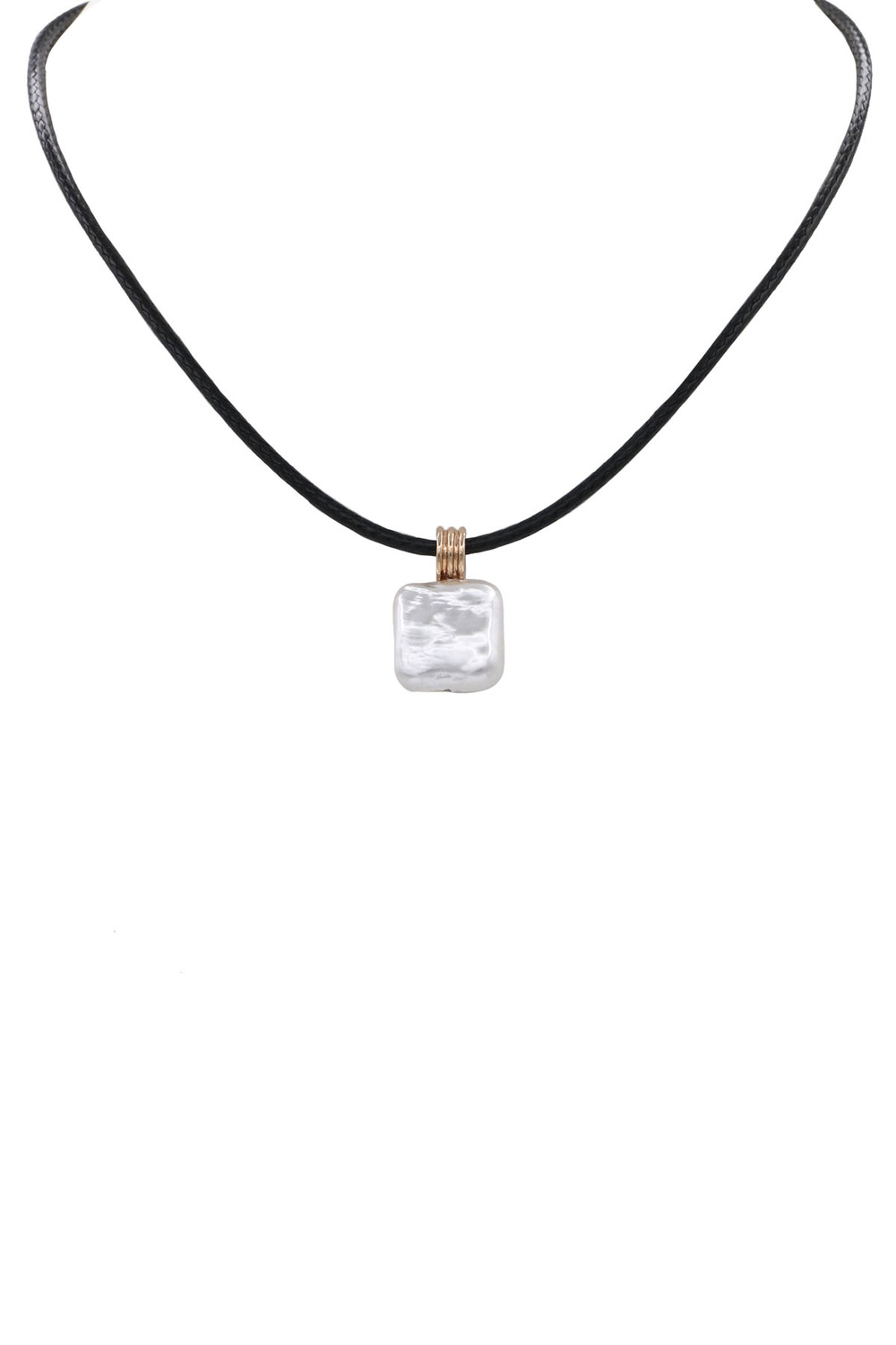 - This necklace pairs a bold black cord with a radiant square glass pearl, creating a modern twist on classic pearl jewelry.