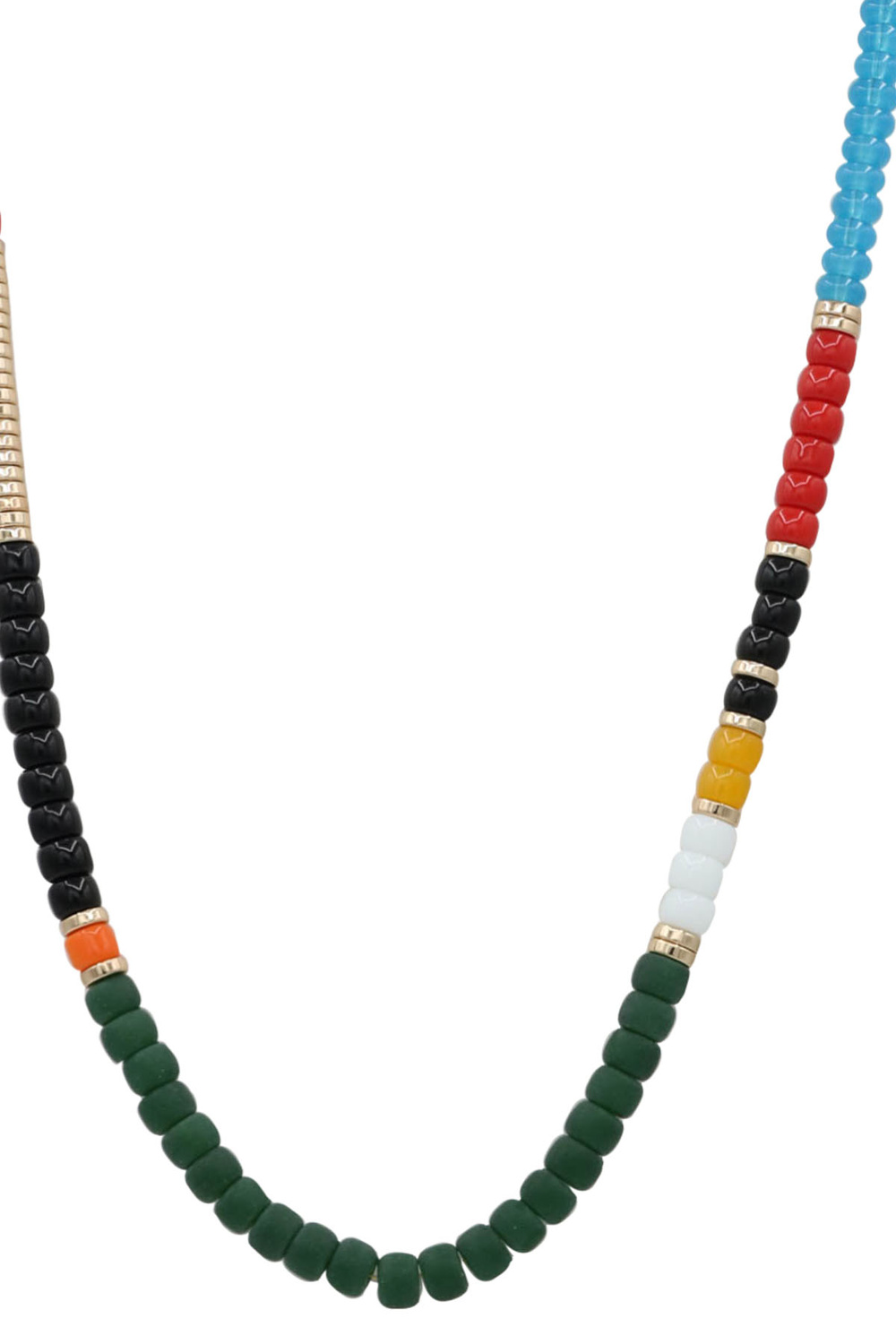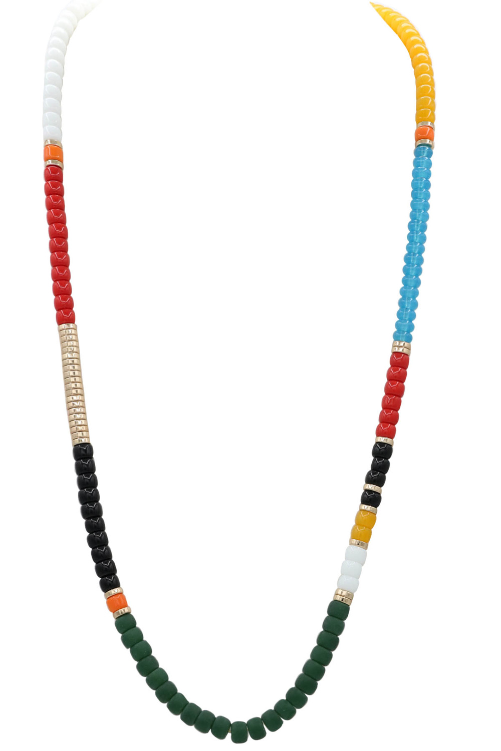- A beautifully layered long necklace featuring mixed beads and metallic disc details.