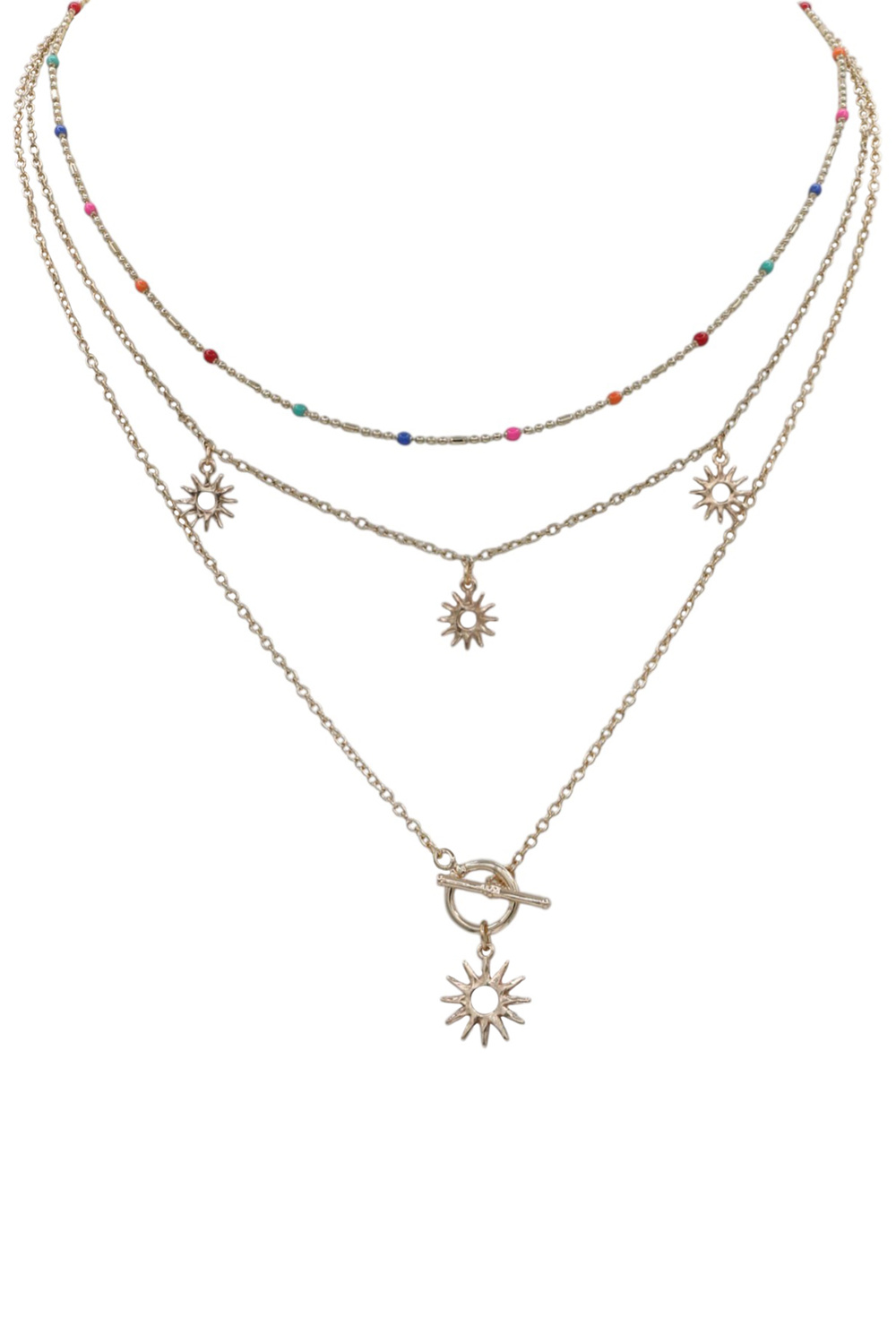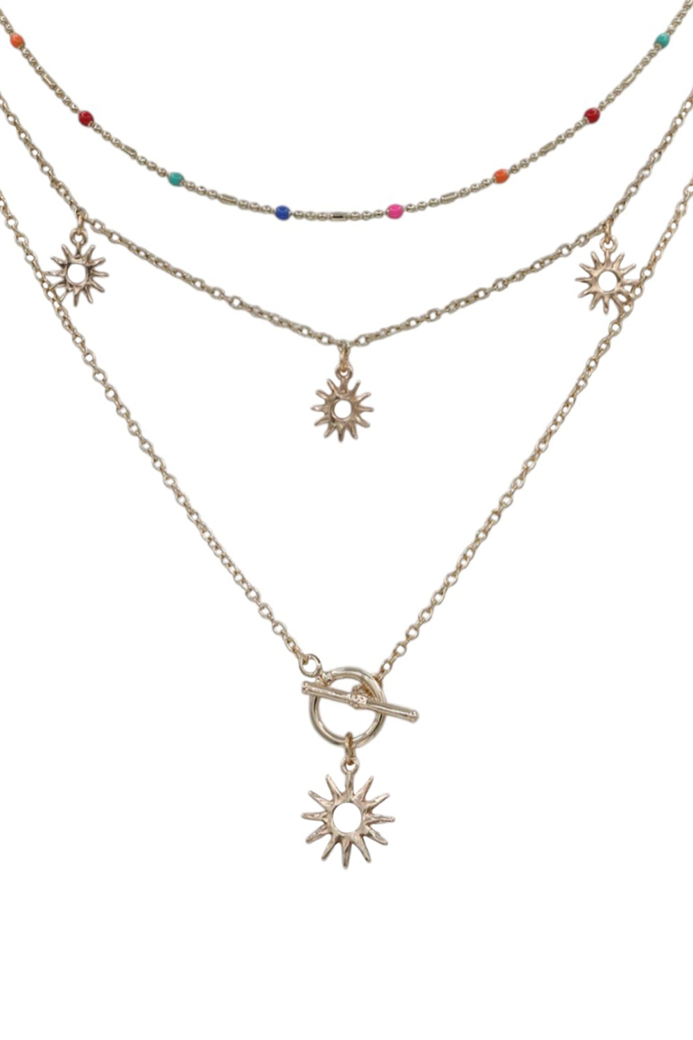 - Chic and radiant, this layered metal necklace showcases a sun pendant for a bold yet feminine look. Perfect for adding a warm, celestial touch to any outfit.