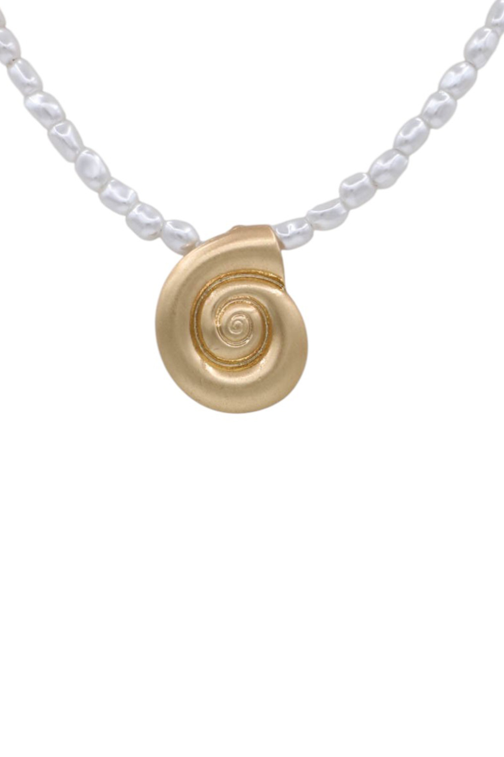 - This exquisite necklace features a delicate strand of cream pearls, each one unique in its subtle irregularity, creating a sense of organic beauty. Suspended at the center is a stunning, matte-finished gold pendant, meticulously crafted in the shape of a seashell's spiral. The subtle matte finish on the gold lends a sophisticated, understated luxury, ensuring it complements rather than overpowers your outfit.