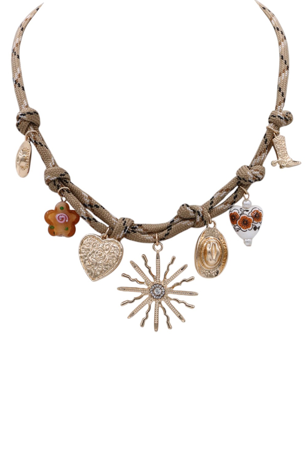 - Cotton rope necklace featuring ceramic sun and heart charms. Natural, lightweight, and perfect for everyday wear.