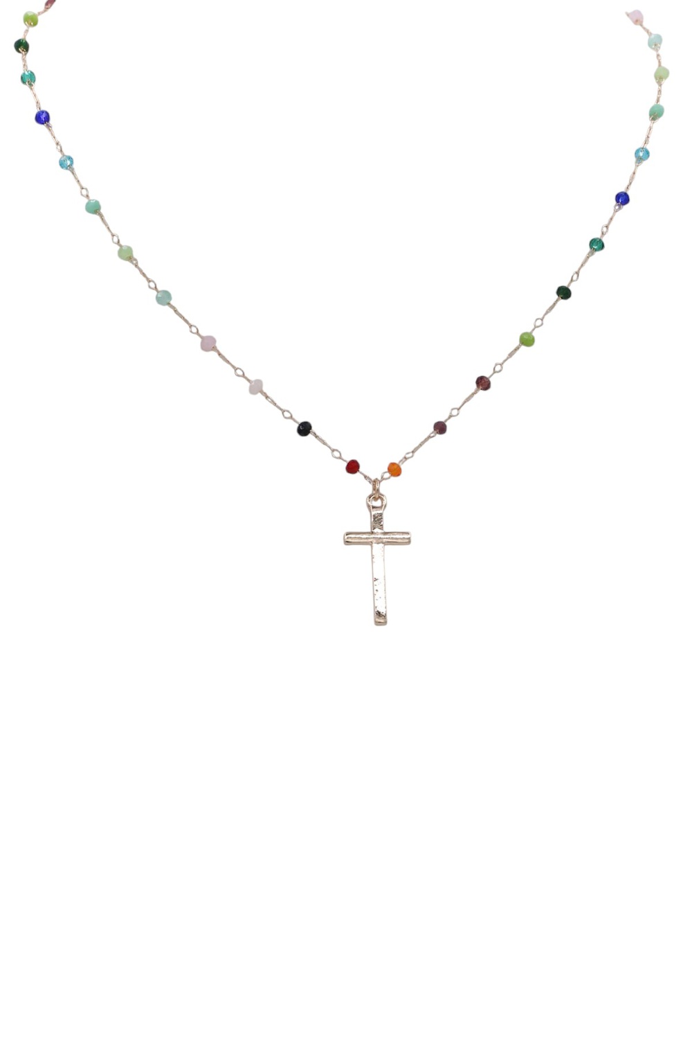 - A beautiful glass beaded necklace featuring a delicate cross pendant. Adds a touch of sparkle and grace to any outfit.