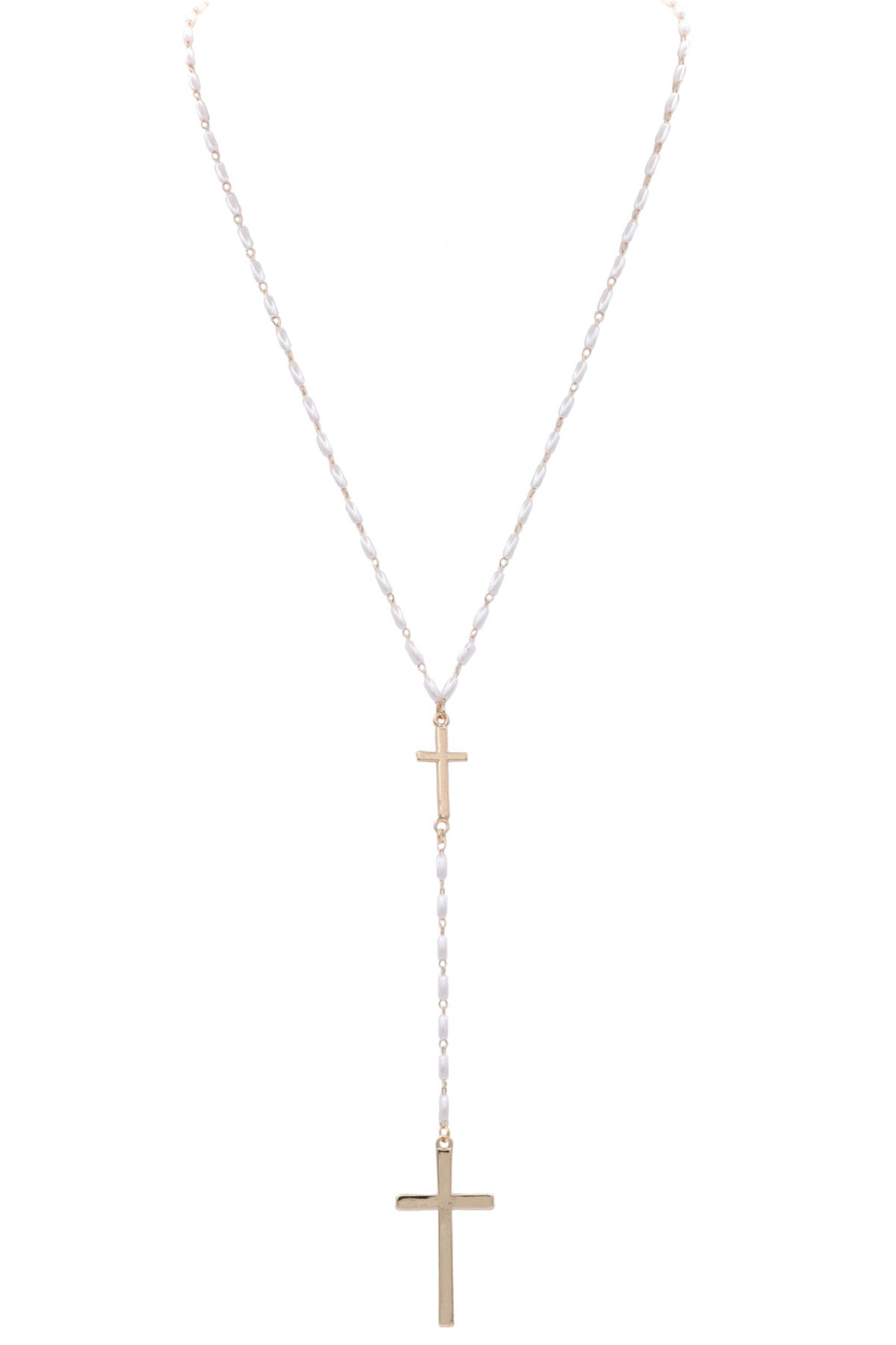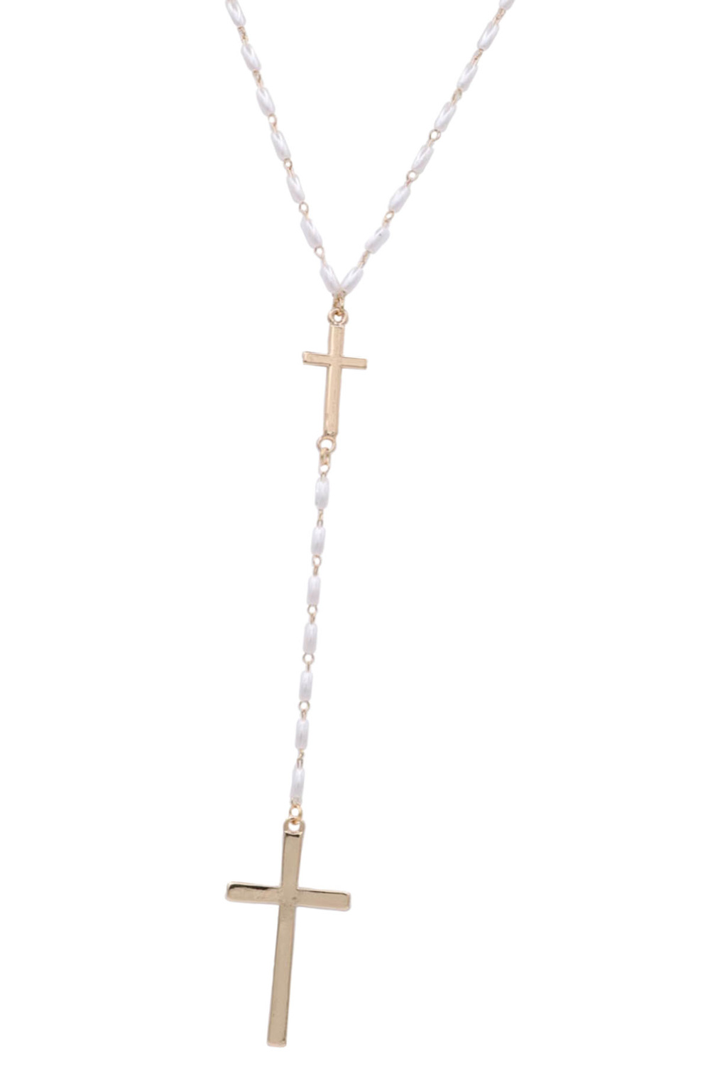 - A graceful Y-lariat design featuring a delicate cross pendant and lustrous cream pearls.
