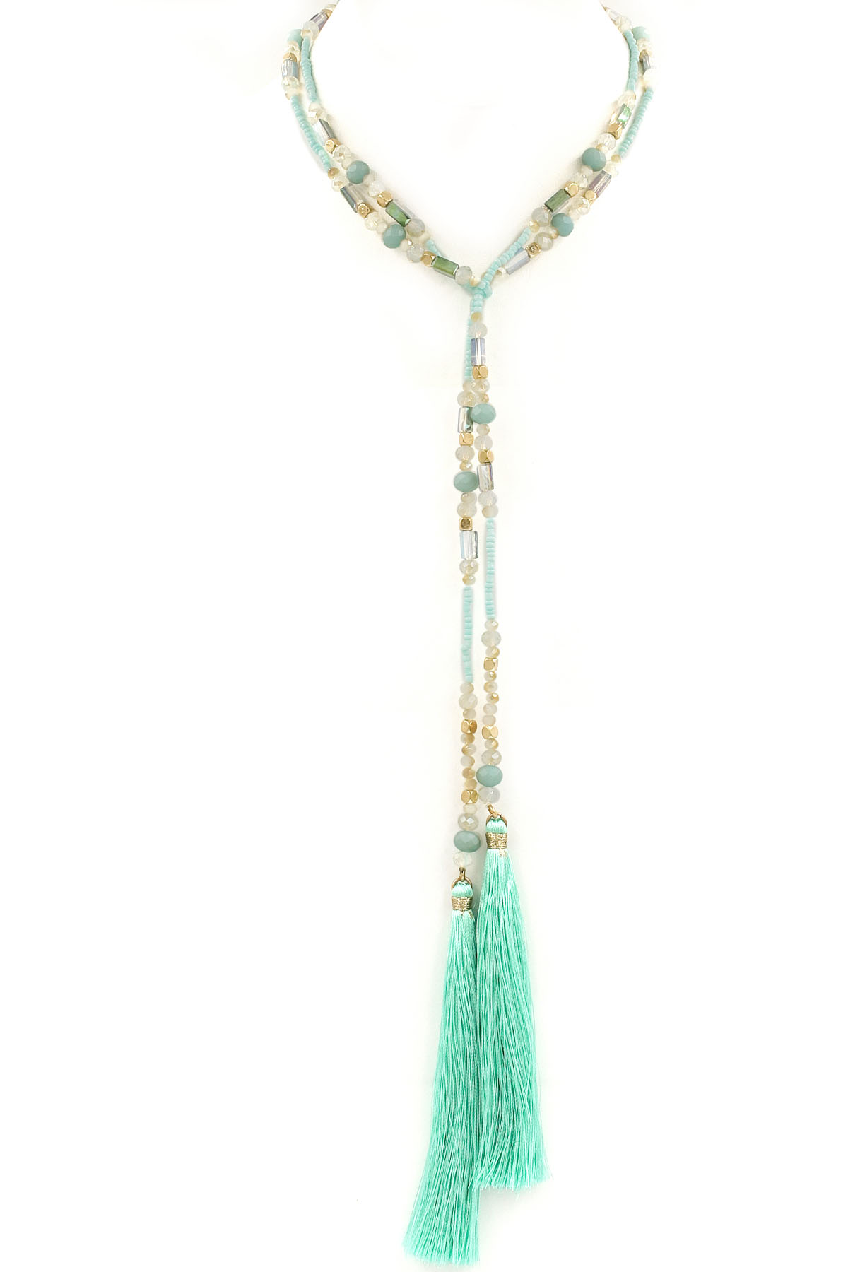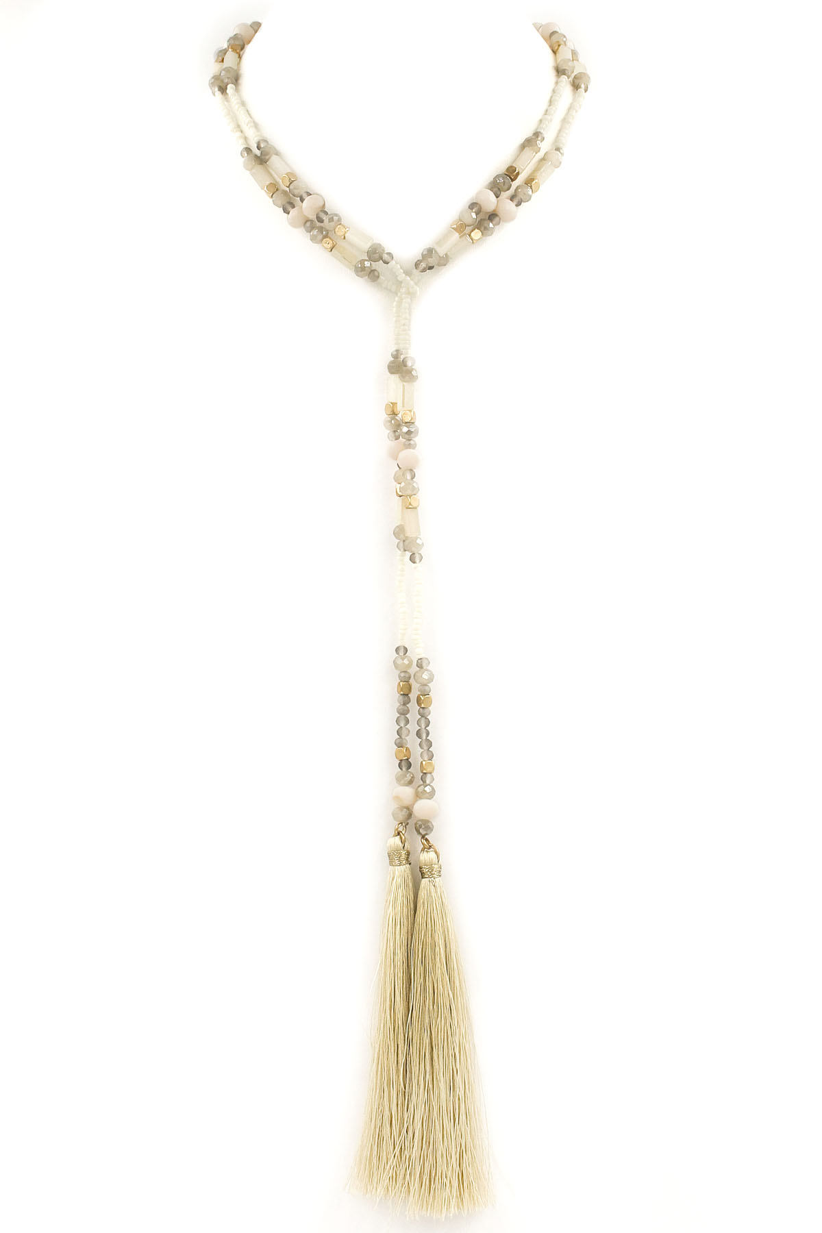 - Faceted glass/seed bead cotton tassel wrap/lariat necklace
