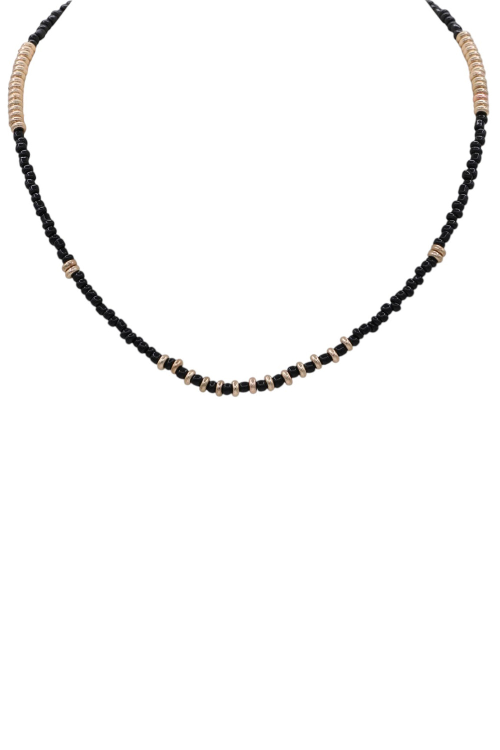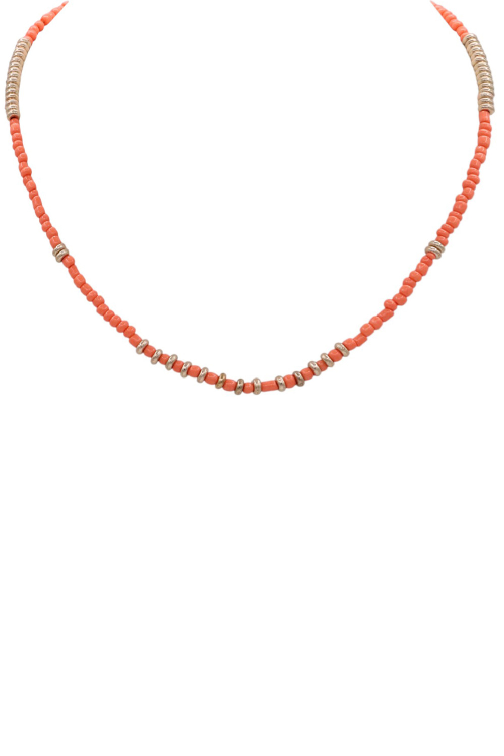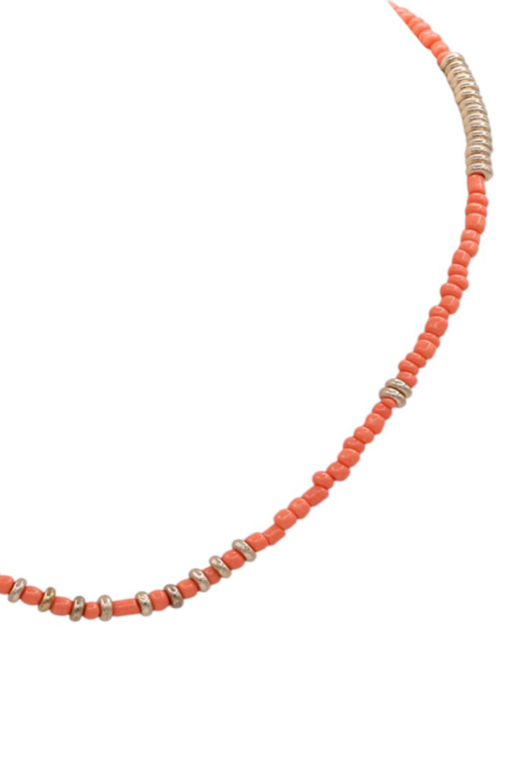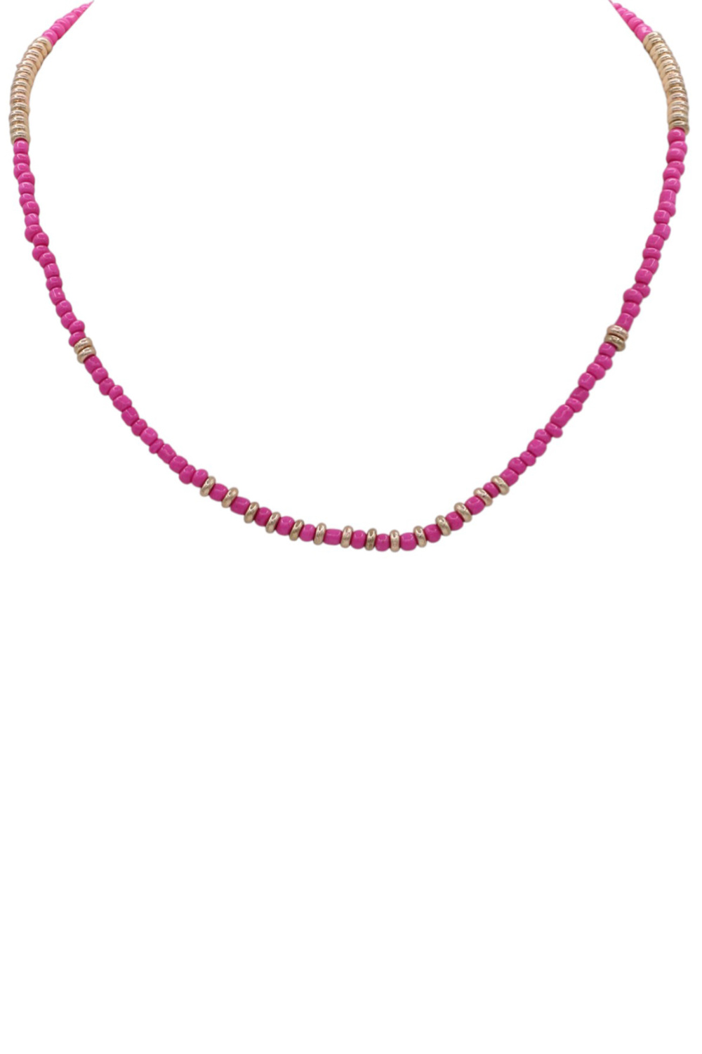 - This vibrant seed beaded necklace is a playful yet chic accessory that adds a pop of color and personality to any outfit. Crafted with small, luminous seed beads in 3 different striking colors. These gold accents create a beautiful contrast with the bold colors, elevating the necklace from a simple beaded piece to a more refined statement. This necklace is a must-have for anyone looking to embrace bold colors and chic, contemporary design in their jewelry collection. It's a versatile piece that transitions seamlessly from day to night, adding a touch of effortless style to any occasion.